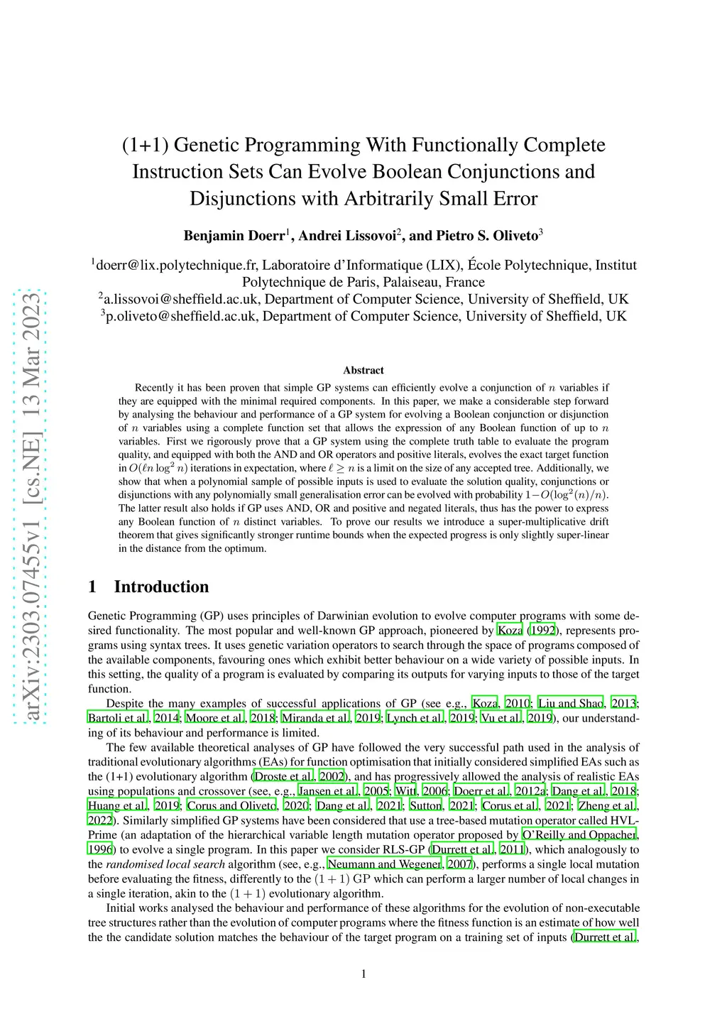 Recently it has been proven that simple GP systems can efficiently evolve a conjunction of variables if they are equipped with the minimal required components. In this paper, we make a considerable step forward by analysing the behaviour and performance of a GP system for evolving a Boolean conjunction or disjunction of variables using a complete function set that allows the expression of any Boolean function of up to variables. First we rigorously prove that a GP system using the complete truth table to evaluate the program quality, and equipped with both the AND and OR operators and positive literals, evolves the exact target function in iterations in expectation, where is a limit on the size of any accepted tree. Additionally, we show that when a polynomial sample of possible inputs is used to evaluate the solution quality, conjunctions or disjunctions with any polynomially small generalisation error can be evolved with probability . The latter result also holds if GP uses AND, OR and positive and negated literals, thus has the power to express any Boolean function of distinct variables. To prove our results we introduce a super-multiplicative drift theorem that gives significantly stronger runtime bounds when the expected progress is only slightly super-linear in the distance from the optimum.