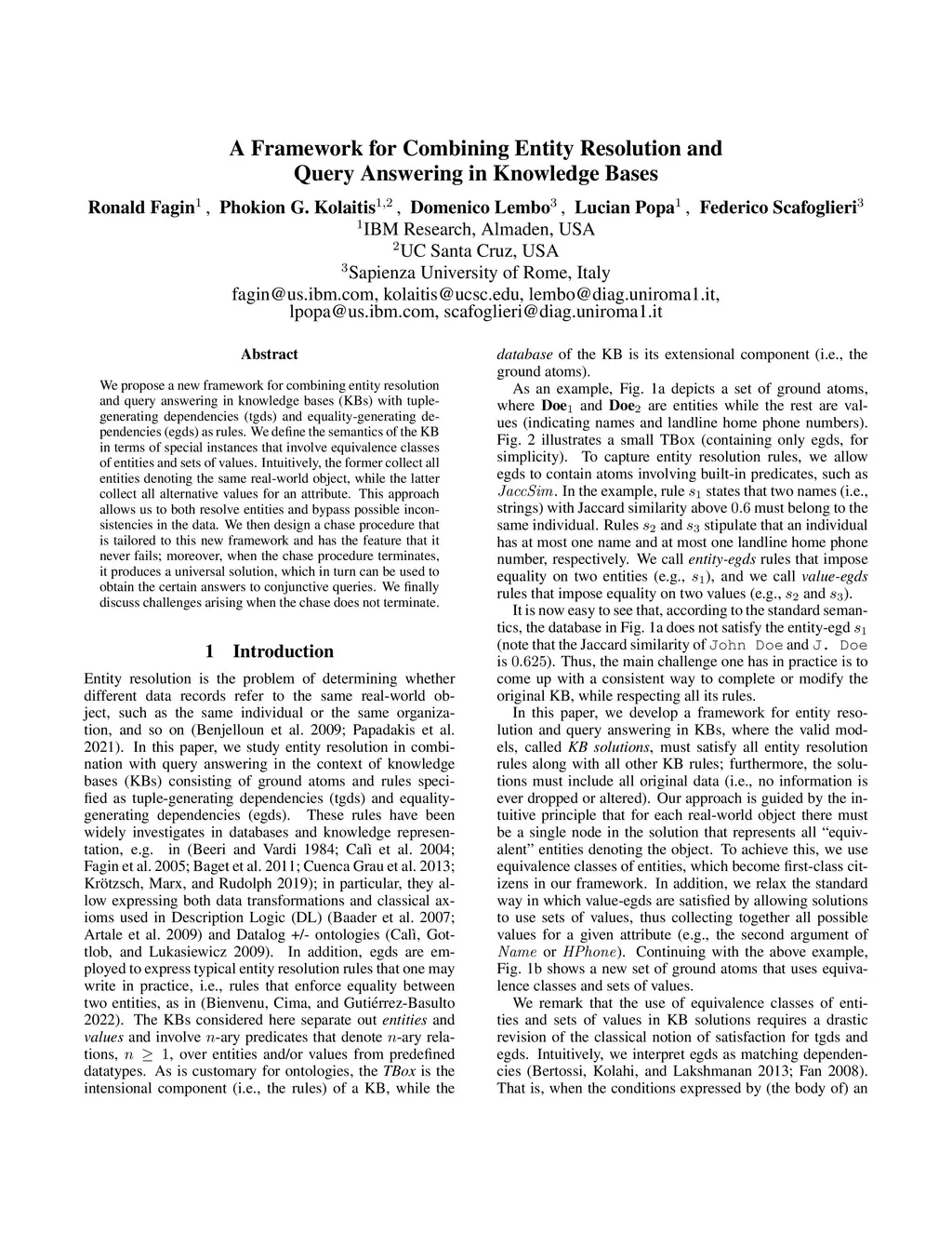 We propose a new framework for combining entity resolution and query answering in knowledge bases (KBs) with tuple-generating dependencies (tgds) and equality-generating dependencies (egds) as rules. We define the semantics of the KB in terms of special instances that involve equivalence classes of entities and sets of values. Intuitively, the former collect all entities denoting the same real-world object, while the latter collect all alternative values for an attribute. This approach allows us to both resolve entities and bypass possible inconsistencies in the data. We then design a chase procedure that is tailored to this new framework and has the feature that it never fails; moreover, when the chase procedure terminates, it produces a universal solution, which in turn can be used to obtain the certain answers to conjunctive queries. We finally discuss challenges arising when the chase does not terminate.