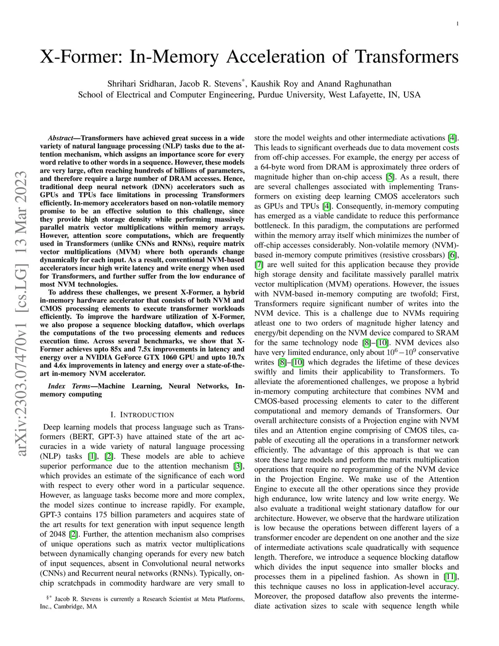 Transformers have achieved great success in a wide variety of natural language processing (NLP) tasks due to the attention mechanism, which assigns an importance score for every word relative to other words in a sequence. However, these models are very large, often reaching hundreds of billions of parameters, and therefore require a large number of DRAM accesses. Hence, traditional deep neural network (DNN) accelerators such as GPUs and TPUs face limitations in processing Transformers efficiently. In-memory accelerators based on non-volatile memory promise to be an effective solution to this challenge, since they provide high storage density while performing massively parallel matrix vector multiplications within memory arrays. However, attention score computations, which are frequently used in Transformers (unlike CNNs and RNNs), require matrix vector multiplications (MVM) where both operands change dynamically for each input. As a result, conventional NVM-based accelerators incur high write latency and write energy when used for Transformers, and further suffer from the low endurance of most NVM technologies. To address these challenges, we present X-Former, a hybrid in-memory hardware accelerator that consists of both NVM and CMOS processing elements to execute transformer workloads efficiently. To improve the hardware utilization of X-Former, we also propose a sequence blocking dataflow, which overlaps the computations of the two processing elements and reduces execution time. Across several benchmarks, we show that X-Former achieves upto 85x and 7.5x improvements in latency and energy over a NVIDIA GeForce GTX 1060 GPU and upto 10.7x and 4.6x improvements in latency and energy over a state-of-the-art in-memory NVM accelerator.