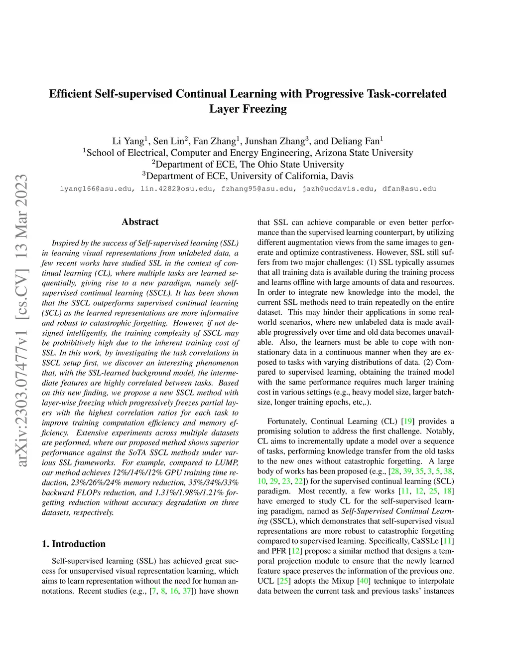 Inspired by the success of Self-supervised learning (SSL) in learning visual representations from unlabeled data, a few recent works have studied SSL in the context of continual learning (CL), where multiple tasks are learned sequentially, giving rise to a new paradigm, namely self-supervised continual learning (SSCL). It has been shown that the SSCL outperforms supervised continual learning (SCL) as the learned representations are more informative and robust to catastrophic forgetting. However, if not designed intelligently, the training complexity of SSCL may be prohibitively high due to the inherent training cost of SSL. In this work, by investigating the task correlations in SSCL setup first, we discover an interesting phenomenon that, with the SSL-learned background model, the intermediate features are highly correlated between tasks. Based on this new finding, we propose a new SSCL method with layer-wise freezing which progressively freezes partial layers with the highest correlation ratios for each task to improve training computation efficiency and memory efficiency. Extensive experiments across multiple datasets are performed, where our proposed method shows superior performance against the SoTA SSCL methods under various SSL frameworks. For example, compared to LUMP, our method achieves 12\%/14\%/12\% GPU training time reduction, 23\%/26\%/24\% memory reduction, 35\%/34\%/33\% backward FLOPs reduction, and 1.31\%/1.98\%/1.21\% forgetting reduction without accuracy degradation on three datasets, respectively.
