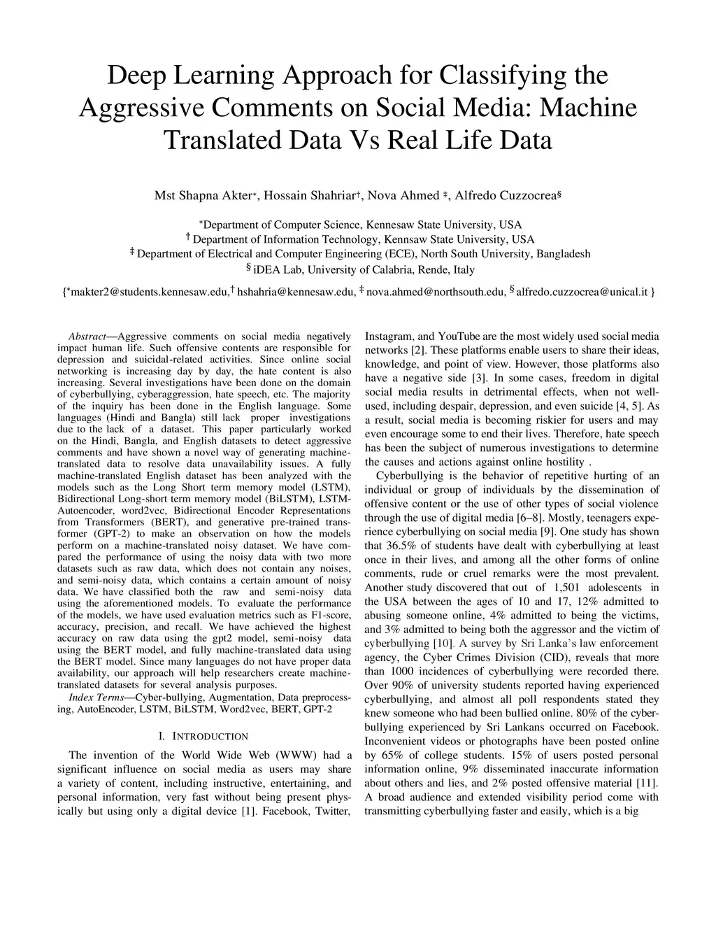 Aggressive comments on social media negatively impact human life. Such offensive contents are responsible for depression and suicidal-related activities. Since online social networking is increasing day by day, the hate content is also increasing. Several investigations have been done on the domain of cyberbullying, cyberaggression, hate speech, etc. The majority of the inquiry has been done in the English language. Some languages (Hindi and Bangla) still lack proper investigations due to the lack of a dataset. This paper particularly worked on the Hindi, Bangla, and English datasets to detect aggressive comments and have shown a novel way of generating machine-translated data to resolve data unavailability issues. A fully machine-translated English dataset has been analyzed with the models such as the Long Short term memory model (LSTM), Bidirectional Long-short term memory model (BiLSTM), LSTM-Autoencoder, word2vec, Bidirectional Encoder Representations from Transformers (BERT), and generative pre-trained transformer (GPT-2) to make an observation on how the models perform on a machine-translated noisy dataset. We have compared the performance of using the noisy data with two more datasets such as raw data, which does not contain any noises, and semi-noisy data, which contains a certain amount of noisy data. We have classified both the raw and semi-noisy data using the aforementioned models. To evaluate the performance of the models, we have used evaluation metrics such as F1-score,accuracy, precision, and recall. We have achieved the highest accuracy on raw data using the gpt2 model, semi-noisy data using the BERT model, and fully machine-translated data using the BERT model. Since many languages do not have proper data availability, our approach will help researchers create machine-translated datasets for several analysis purposes.