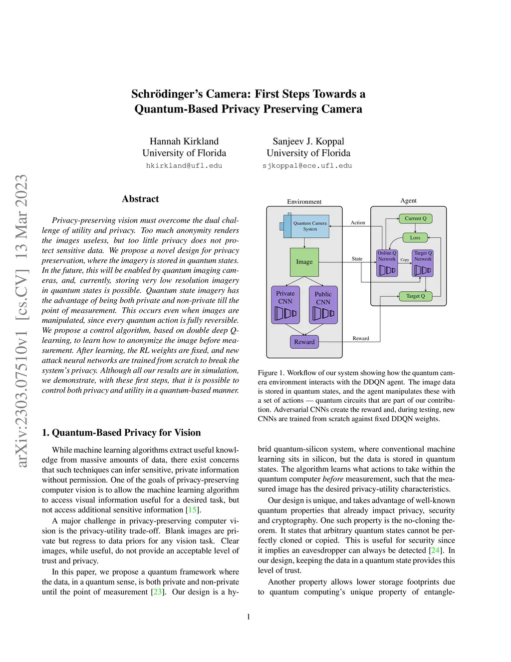 Privacy-preserving vision must overcome the dual challenge of utility and privacy. Too much anonymity renders the images useless, but too little privacy does not protect sensitive data. We propose a novel design for privacy preservation, where the imagery is stored in quantum states. In the future, this will be enabled by quantum imaging cameras, and, currently, storing very low resolution imagery in quantum states is possible. Quantum state imagery has the advantage of being both private and non-private till the point of measurement. This occurs even when images are manipulated, since every quantum action is fully reversible. We propose a control algorithm, based on double deep Q-learning, to learn how to anonymize the image before measurement. After learning, the RL weights are fixed, and new attack neural networks are trained from scratch to break the system's privacy. Although all our results are in simulation, we demonstrate, with these first steps, that it is possible to control both privacy and utility in a quantum-based manner.