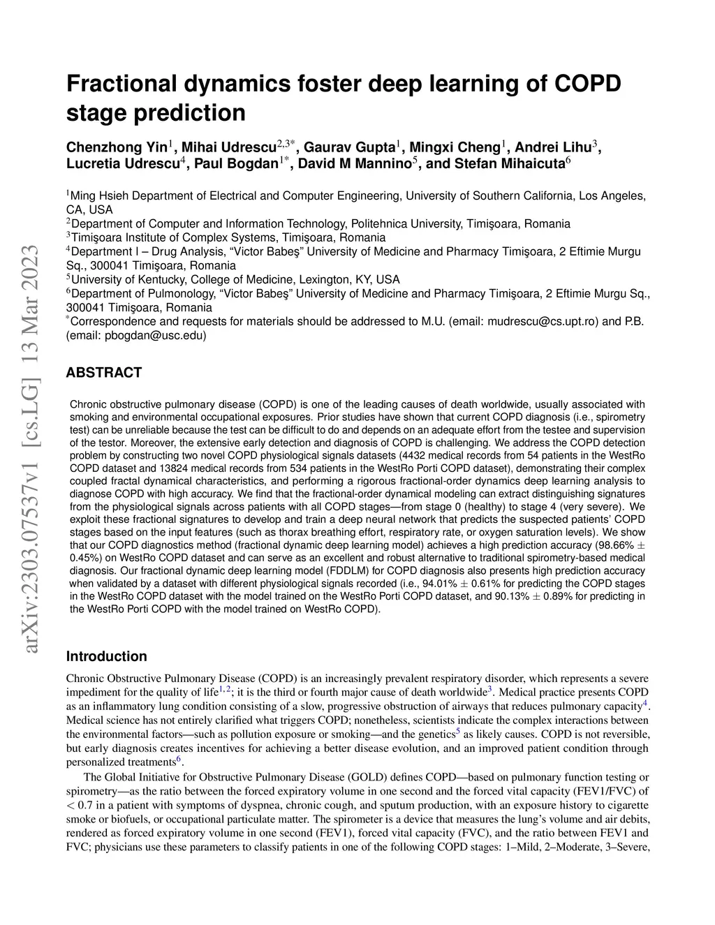 Chronic obstructive pulmonary disease (COPD) is one of the leading causes of death worldwide. Current COPD diagnosis (i.e., spirometry) could be unreliable because the test depends on an adequate effort from the tester and testee. Moreover, the early diagnosis of COPD is challenging. We address COPD detection by constructing two novel physiological signals datasets (4432 records from 54 patients in the WestRo COPD dataset and 13824 medical records from 534 patients in the WestRo Porti COPD dataset). The authors demonstrate their complex coupled fractal dynamical characteristics and perform a fractional-order dynamics deep learning analysis to diagnose COPD. The authors found that the fractional-order dynamical modeling can extract distinguishing signatures from the physiological signals across patients with all COPD stages from stage 0 (healthy) to stage 4 (very severe). They use the fractional signatures to develop and train a deep neural network that predicts COPD stages based on the input features (such as thorax breathing effort, respiratory rate, or oxygen saturation). The authors show that the fractional dynamic deep learning model (FDDLM) achieves a COPD prediction accuracy of 98.66% and can serve as a robust alternative to spirometry. The FDDLM also has high accuracy when validated on a dataset with different physiological signals.