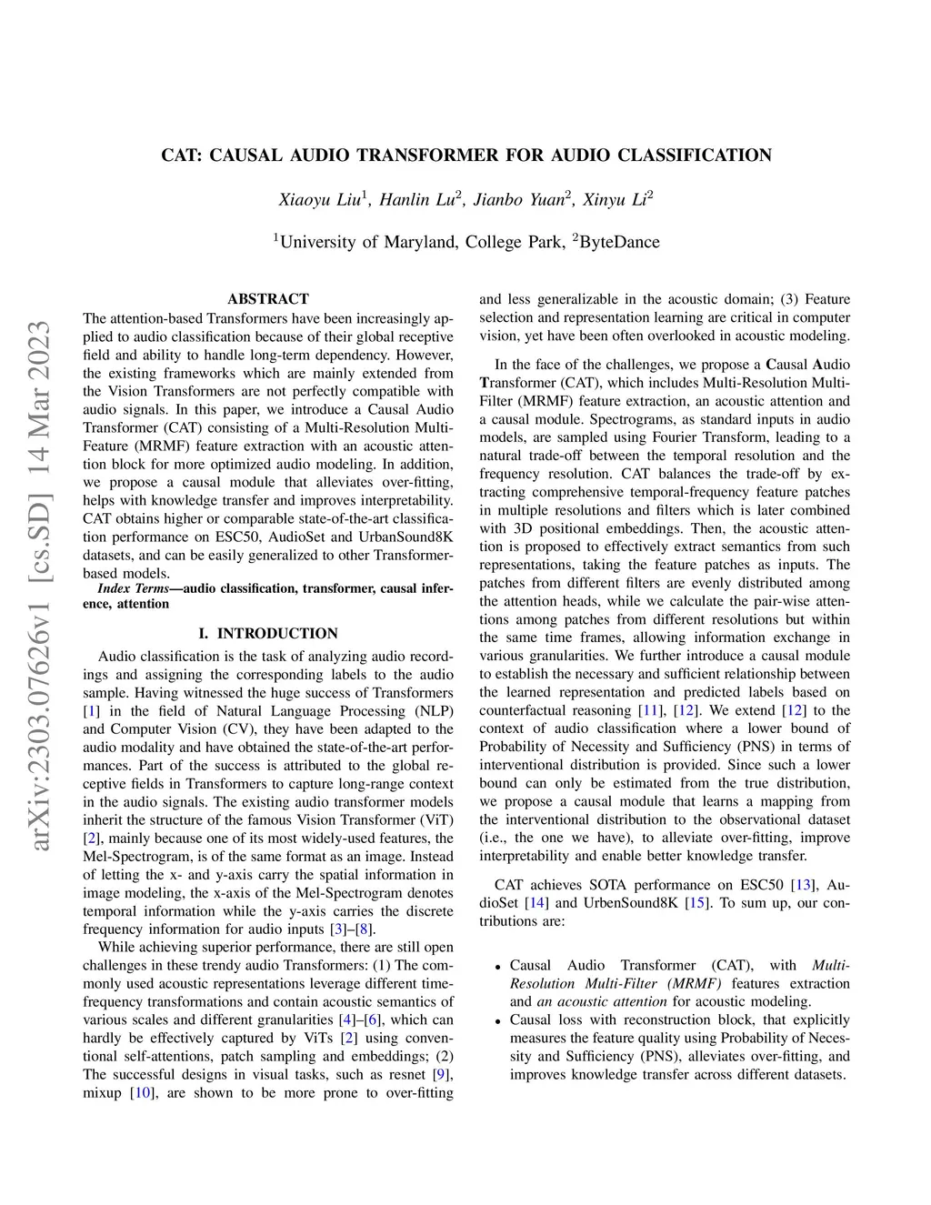 The attention-based Transformers have been increasingly applied to audio classification because of their global receptive field and ability to handle long-term dependency. However, the existing frameworks which are mainly extended from the Vision Transformers are not perfectly compatible with audio signals. In this paper, we introduce a Causal Audio Transformer (CAT) consisting of a Multi-Resolution Multi-Feature (MRMF) feature extraction with an acoustic attention block for more optimized audio modeling. In addition, we propose a causal module that alleviates over-fitting, helps with knowledge transfer, and improves interpretability. CAT obtains higher or comparable state-of-the-art classification performance on ESC50, AudioSet and UrbanSound8K datasets, and can be easily generalized to other Transformer-based models.
