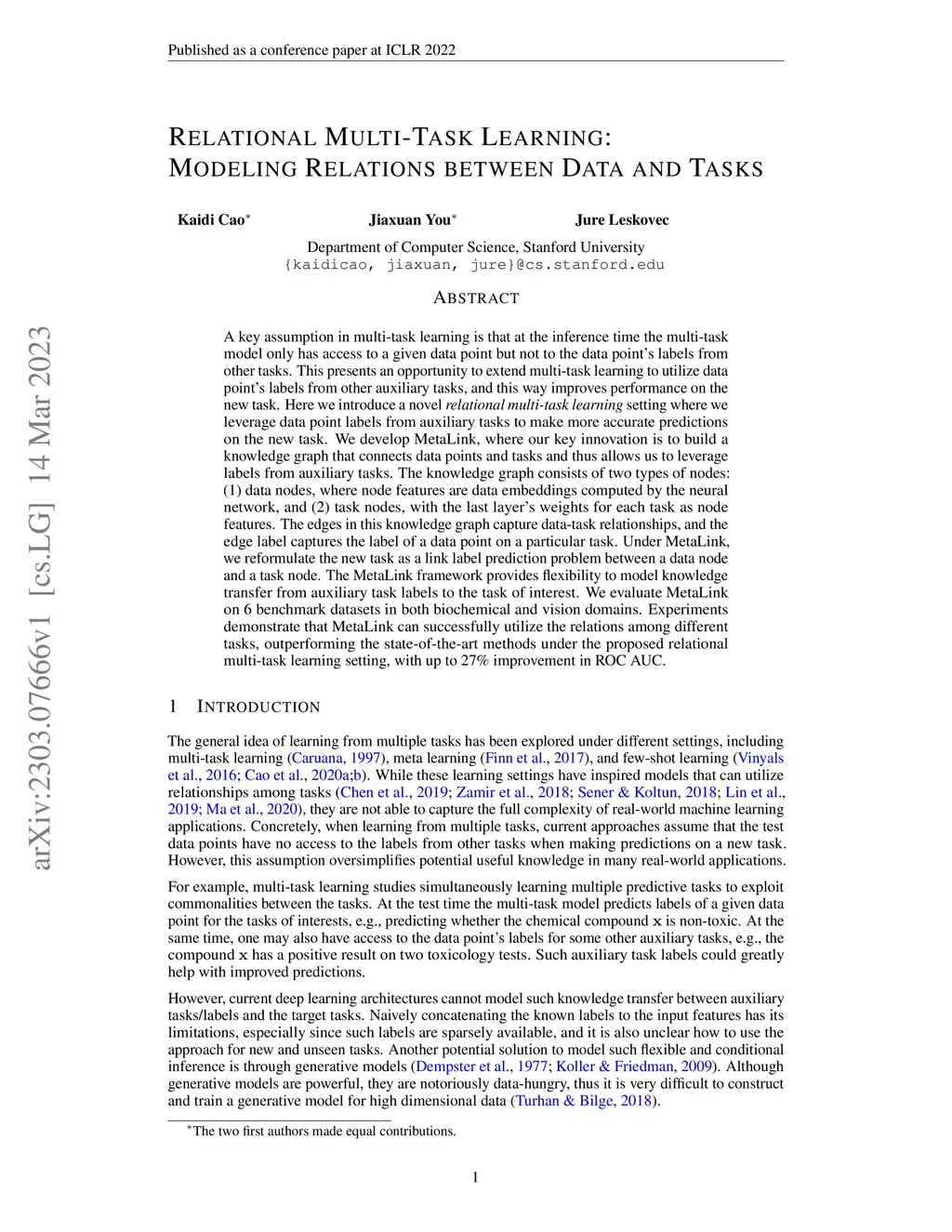 A key assumption in multi-task learning is that at the inference time the multi-task model only has access to a given data point but not to the data point's labels from other tasks. This presents an opportunity to extend multi-task learning to utilize data point's labels from other auxiliary tasks, and this way improves performance on the new task. Here we introduce a novel relational multi-task learning setting where we leverage data point labels from auxiliary tasks to make more accurate predictions on the new task. We develop MetaLink, where our key innovation is to build a knowledge graph that connects data points and tasks and thus allows us to leverage labels from auxiliary tasks. The knowledge graph consists of two types of nodes: (1) data nodes, where node features are data embeddings computed by the neural network, and (2) task nodes, with the last layer's weights for each task as node features. The edges in this knowledge graph capture data-task relationships, and the edge label captures the label of a data point on a particular task. Under MetaLink, we reformulate the new task as a link label prediction problem between a data node and a task node. The MetaLink framework provides flexibility to model knowledge transfer from auxiliary task labels to the task of interest. We evaluate MetaLink on 6 benchmark datasets in both biochemical and vision domains. Experiments demonstrate that MetaLink can successfully utilize the relations among different tasks, outperforming the state-of-the-art methods under the proposed relational multi-task learning setting, with up to 27% improvement in ROC AUC.