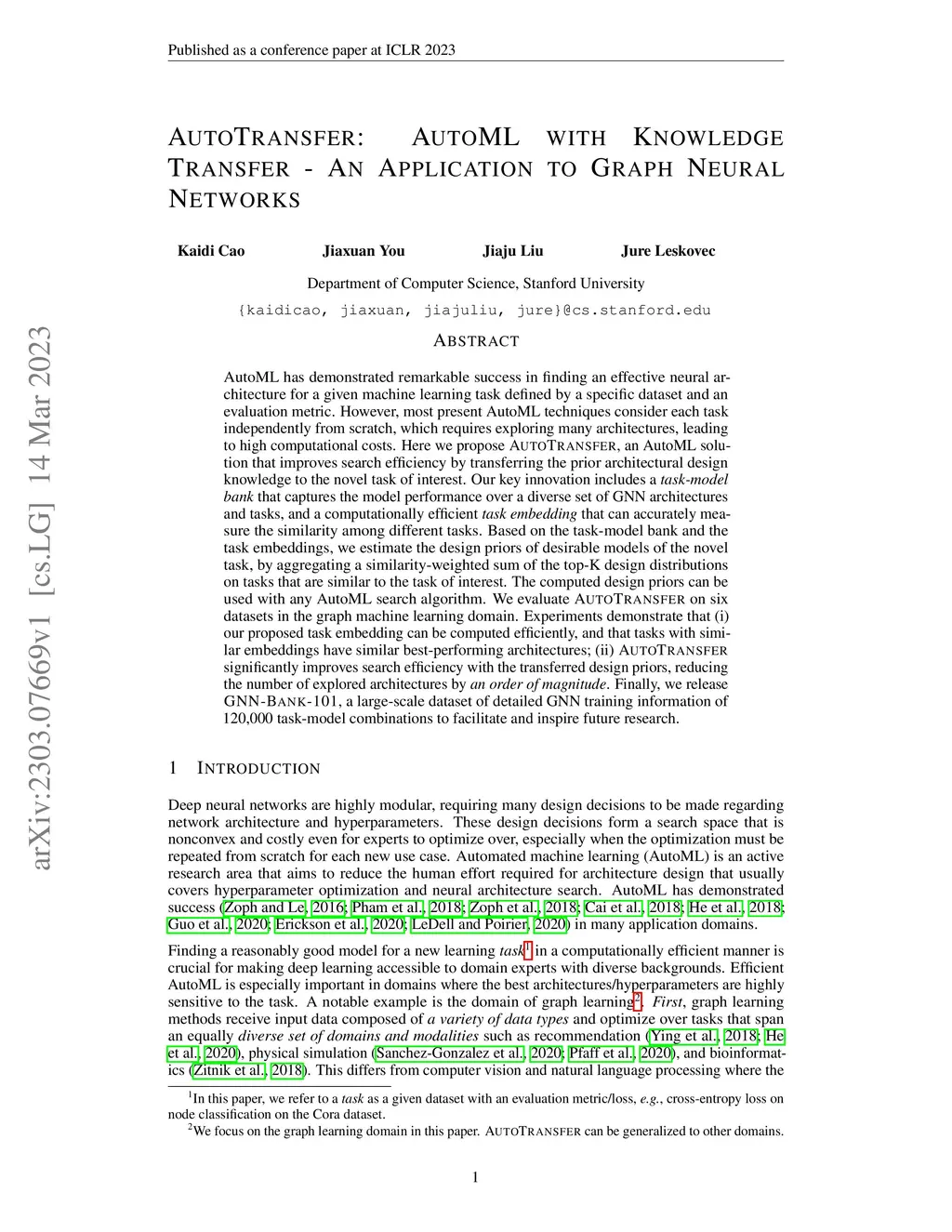 AutoTransfer: AutoML with Knowledge Transfer -- An Application to Graph