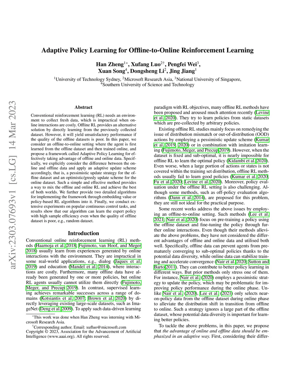 Adaptive Policy Learning for Offline-to-Online Reinforcement Learning
