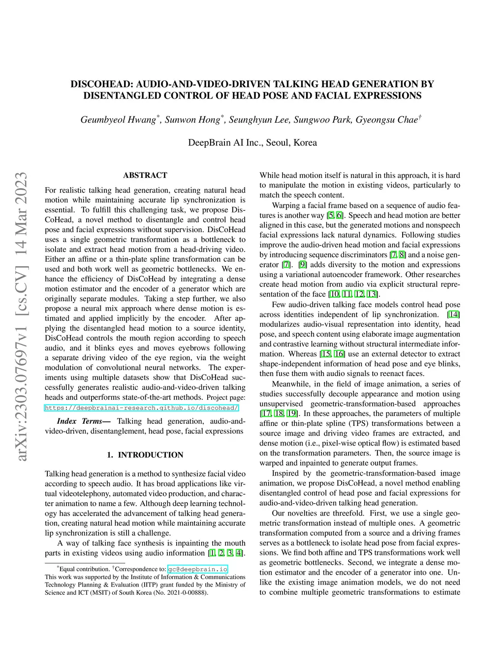 DisCoHead: Audio-and-Video-Driven Talking Head Generation by
