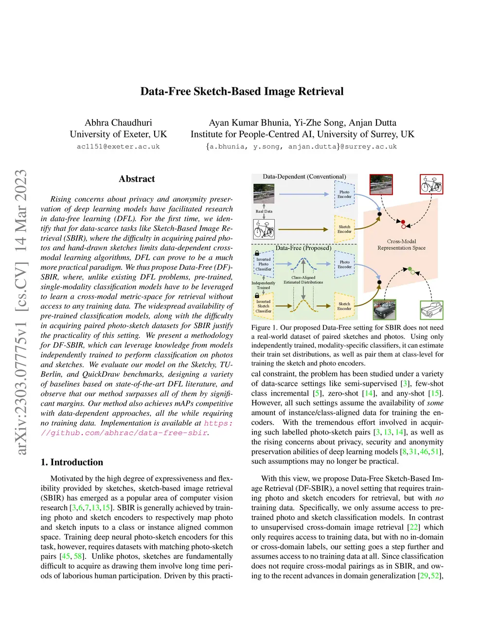 Rising concerns about privacy and anonymity preservation of deep learning models have facilitated research in data-free learning (DFL). For the first time, we identify that for data-scarce tasks like Sketch-Based Image Retrieval (SBIR), where the difficulty in acquiring paired photos and hand-drawn sketches limits data-dependent cross-modal learning algorithms, DFL can prove to be a much more practical paradigm. We thus propose Data-Free (DF)-SBIR, where, unlike existing DFL problems, pre-trained, single-modality classification models have to be leveraged to learn a cross-modal metric-space for retrieval without access to any training data. The widespread availability of pre-trained classification models, along with the difficulty in acquiring paired photo-sketch datasets for SBIR justify the practicality of this setting. We present a methodology for DF-SBIR, which can leverage knowledge from models independently trained to perform classification on photos and sketches. We evaluate our model on the Sketchy, TU-Berlin, and QuickDraw benchmarks, designing a variety of baselines based on state-of-the-art DFL literature, and observe that our method surpasses all of them by significant margins. Our method also achieves mAPs competitive with data-dependent approaches, all the while requiring no training data. Implementation is available at \url{https://github.com/abhrac/data-free-sbir}.