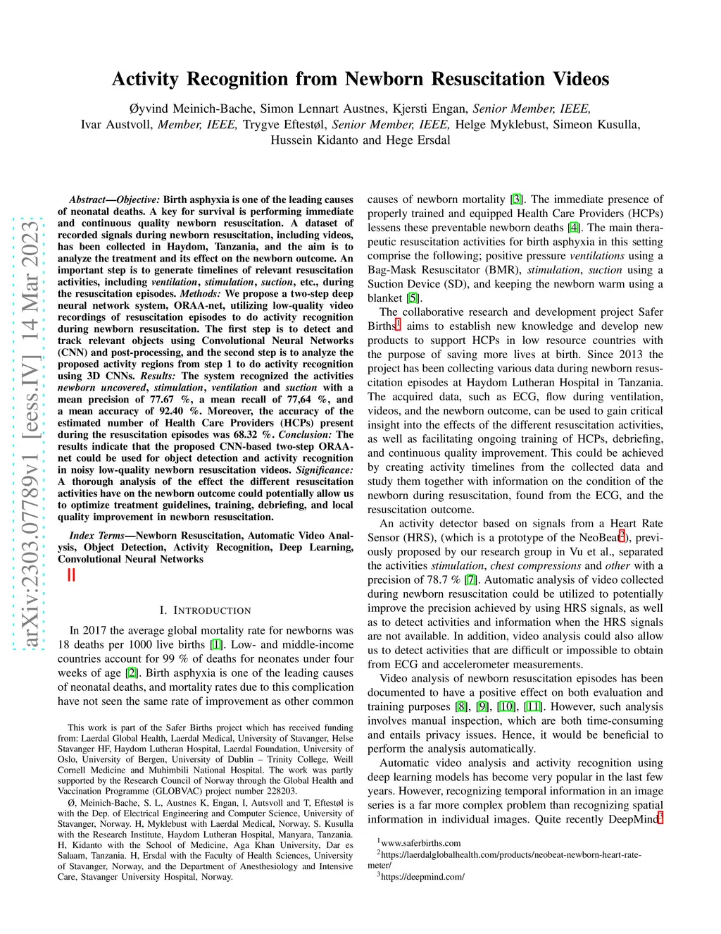 Objective: Birth asphyxia is one of the leading causes of neonatal deaths. A key for survival is performing immediate and continuous quality newborn resuscitation. A dataset of recorded signals during newborn resuscitation, including videos, has been collected in Haydom, Tanzania, and the aim is to analyze the treatment and its effect on the newborn outcome. An important step is to generate timelines of relevant resuscitation activities, including ventilation, stimulation, suction, etc., during the resuscitation episodes. Methods: We propose a two-step deep neural network system, ORAA-net, utilizing low-quality video recordings of resuscitation episodes to do activity recognition during newborn resuscitation. The first step is to detect and track relevant objects using Convolutional Neural Networks (CNN) and post-processing, and the second step is to analyze the proposed activity regions from step 1 to do activity recognition using 3D CNNs. Results: The system recognized the activities newborn uncovered, stimulation, ventilation and suction with a mean precision of 77.67 %, a mean recall of 77,64 %, and a mean accuracy of 92.40 %. Moreover, the accuracy of the estimated number of Health Care Providers (HCPs) present during the resuscitation episodes was 68.32 %. Conclusion: The results indicate that the proposed CNN-based two-step ORAAnet could be used for object detection and activity recognition in noisy low-quality newborn resuscitation videos. Significance: A thorough analysis of the effect the different resuscitation activities have on the newborn outcome could potentially allow us to optimize treatment guidelines, training, debriefing, and local quality improvement in newborn resuscitation.