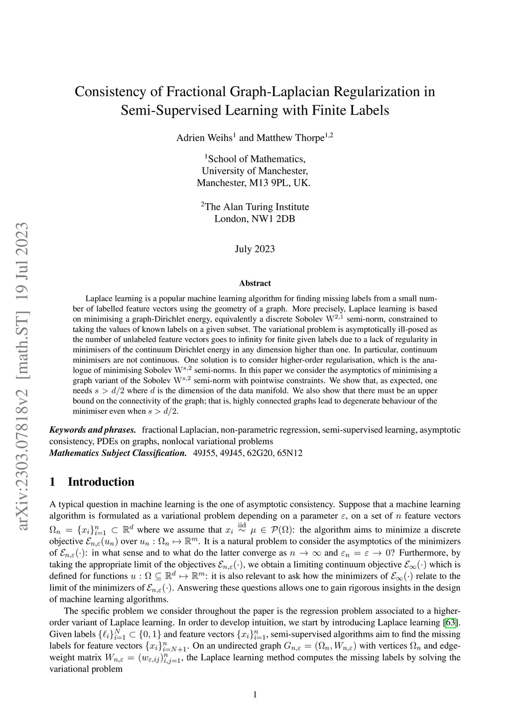 Laplace learning is a popular machine learning algorithm for finding missing labels from a small number of labelled feature vectors using the geometry of a graph. More precisely, Laplace learning is based on minimising a graph-Dirichlet energy, equivalently a discrete Sobolev semi-norm, constrained to taking the values of known labels on a given subset. The variational problem is asymptotically ill-posed as the number of unlabeled feature vectors goes to infinity for finite given labels due to a lack of regularity in minimisers of the continuum Dirichlet energy in any dimension higher than one. In particular, continuum minimisers are not continuous. One solution is to consider higher-order regularisation, which is the analogue of minimising Sobolev semi-norms. In this paper we consider the asymptotics of minimising a graph variant of the Sobolev semi-norm with pointwise constraints. We show that, as expected, one needs where is the dimension of the data manifold. We also show that there must be an upper bound on the connectivity of the graph; that is, highly connected graphs lead to degenerate behaviour of the minimiser even when .
