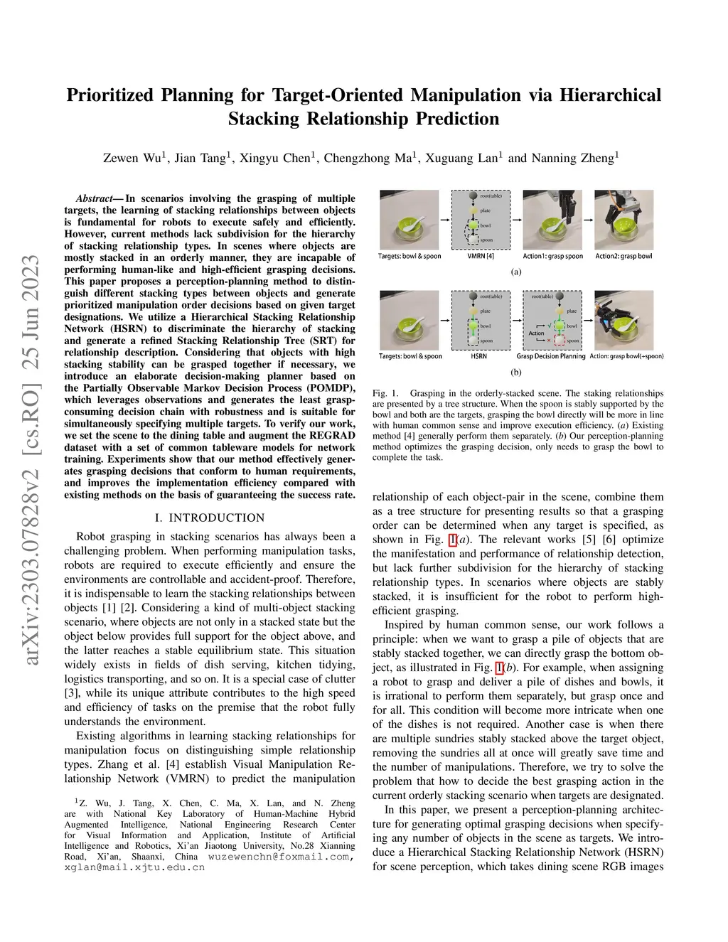 In scenarios involving the grasping of multiple targets, the learning of stacking relationships between objects is fundamental for robots to execute safely and efficiently. However, current methods lack subdivision for the hierarchy of stacking relationship types. In scenes where objects are mostly stacked in an orderly manner, they are incapable of performing human-like and high-efficient grasping decisions. This paper proposes a perception-planning method to distinguish different stacking types between objects and generate prioritized manipulation order decisions based on given target designations. We utilize a Hierarchical Stacking Relationship Network (HSRN) to discriminate the hierarchy of stacking and generate a refined Stacking Relationship Tree (SRT) for relationship description. Considering that objects with high stacking stability can be grasped together if necessary, we introduce an elaborate decision-making planner based on the Partially Observable Markov Decision Process (POMDP), which leverages observations and generates the least grasp-consuming decision chain with robustness and is suitable for simultaneously specifying multiple targets. To verify our work, we set the scene to the dining table and augment the REGRAD dataset with a set of common tableware models for network training. Experiments show that our method effectively generates grasping decisions that conform to human requirements, and improves the implementation efficiency compared with existing methods on the basis of guaranteeing the success rate.