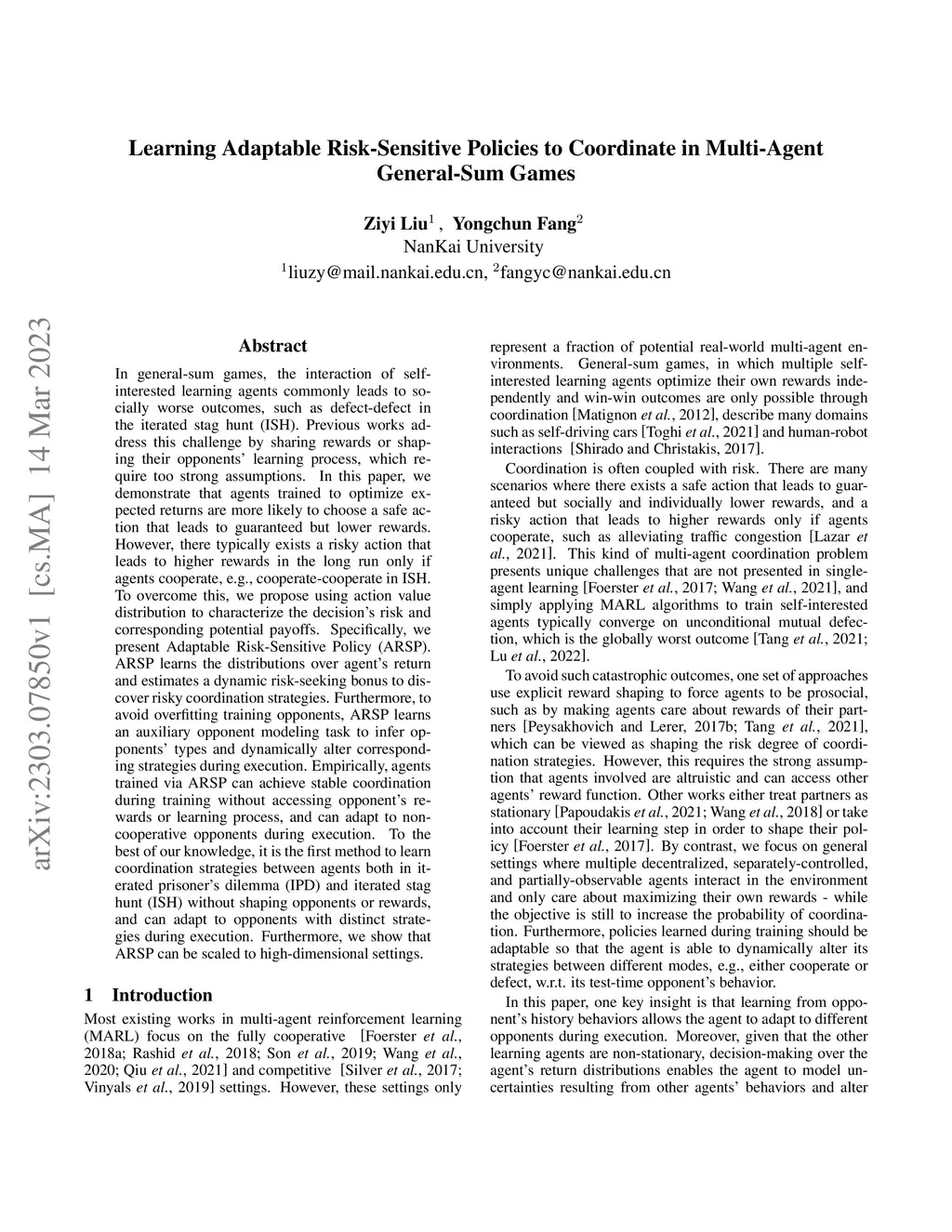 In general-sum games, the interaction of self-interested learning agents commonly leads to socially worse outcomes, such as defect-defect in the iterated stag hunt (ISH). Previous works address this challenge by sharing rewards or shaping their opponents' learning process, which require too strong assumptions. In this paper, we demonstrate that agents trained to optimize expected returns are more likely to choose a safe action that leads to guaranteed but lower rewards. However, there typically exists a risky action that leads to higher rewards in the long run only if agents cooperate, e.g., cooperate-cooperate in ISH. To overcome this, we propose using action value distribution to characterize the decision's risk and corresponding potential payoffs. Specifically, we present Adaptable Risk-Sensitive Policy (ARSP). ARSP learns the distributions over agent's return and estimates a dynamic risk-seeking bonus to discover risky coordination strategies. Furthermore, to avoid overfitting training opponents, ARSP learns an auxiliary opponent modeling task to infer opponents' types and dynamically alter corresponding strategies during execution. Empirically, agents trained via ARSP can achieve stable coordination during training without accessing opponent's rewards or learning process, and can adapt to non-cooperative opponents during execution. To the best of our knowledge, it is the first method to learn coordination strategies between agents both in iterated prisoner's dilemma (IPD) and iterated stag hunt (ISH) without shaping opponents or rewards, and can adapt to opponents with distinct strategies during execution. Furthermore, we show that ARSP can be scaled to high-dimensional settings.