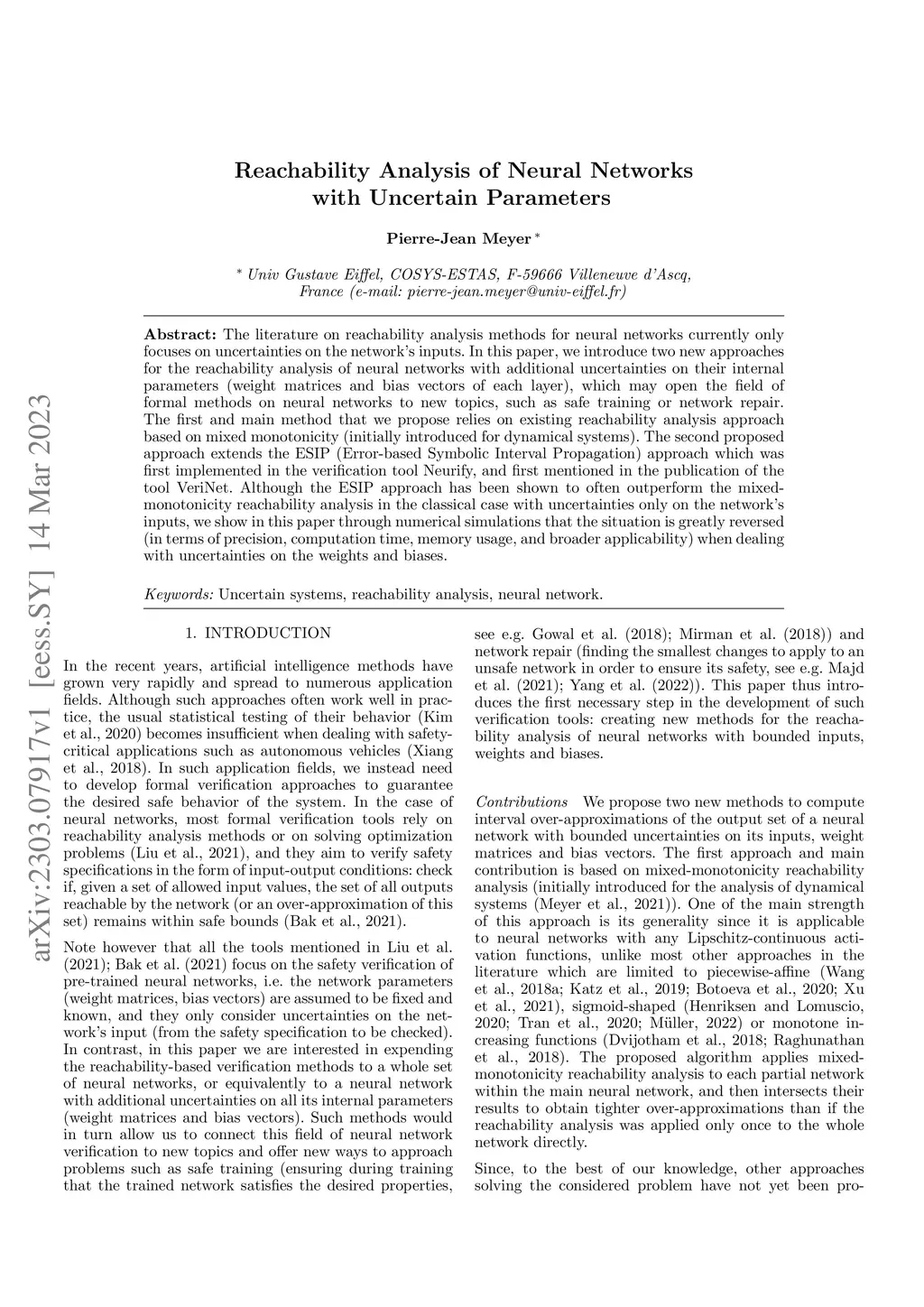 The literature on reachability analysis methods for neural networks currently only focuses on uncertainties on the network's inputs. In this paper, we introduce two new approaches for the reachability analysis of neural networks with additional uncertainties on their internal parameters (weight matrices and bias vectors of each layer), which may open the field of formal methods on neural networks to new topics, such as safe training or network repair. The first and main method that we propose relies on existing reachability analysis approach based on mixed monotonicity (initially introduced for dynamical systems). The second proposed approach extends the ESIP (Error-based Symbolic Interval Propagation) approach which was first implemented in the verification tool Neurify, and first mentioned in the publication of the tool VeriNet. Although the ESIP approach has been shown to often outperform the mixed-monotonicity reachability analysis in the classical case with uncertainties only on the network's inputs, we show in this paper through numerical simulations that the situation is greatly reversed (in terms of precision, computation time, memory usage, and broader applicability) when dealing with uncertainties on the weights and biases.