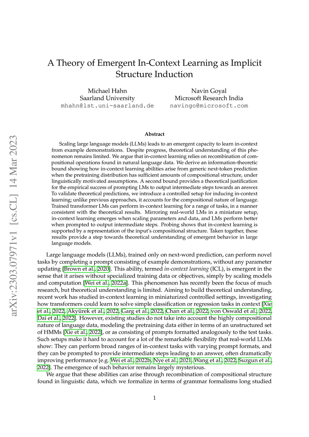 Scaling large language models (LLMs) leads to an emergent capacity to learn in-context from example demonstrations. Despite progress, theoretical understanding of this phenomenon remains limited. We argue that in-context learning relies on recombination of compositional operations found in natural language data. We derive an information-theoretic bound showing how in-context learning abilities arise from generic next-token prediction when the pretraining distribution has sufficient amounts of compositional structure, under linguistically motivated assumptions. A second bound provides a theoretical justification for the empirical success of prompting LLMs to output intermediate steps towards an answer. To validate theoretical predictions, we introduce a controlled setup for inducing in-context learning; unlike previous approaches, it accounts for the compositional nature of language. Trained transformers can perform in-context learning for a range of tasks, in a manner consistent with the theoretical results. Mirroring real-world LLMs in a miniature setup, in-context learning emerges when scaling parameters and data, and models perform better when prompted to output intermediate steps. Probing shows that in-context learning is supported by a representation of the input's compositional structure. Taken together, these results provide a step towards theoretical understanding of emergent behavior in large language models.