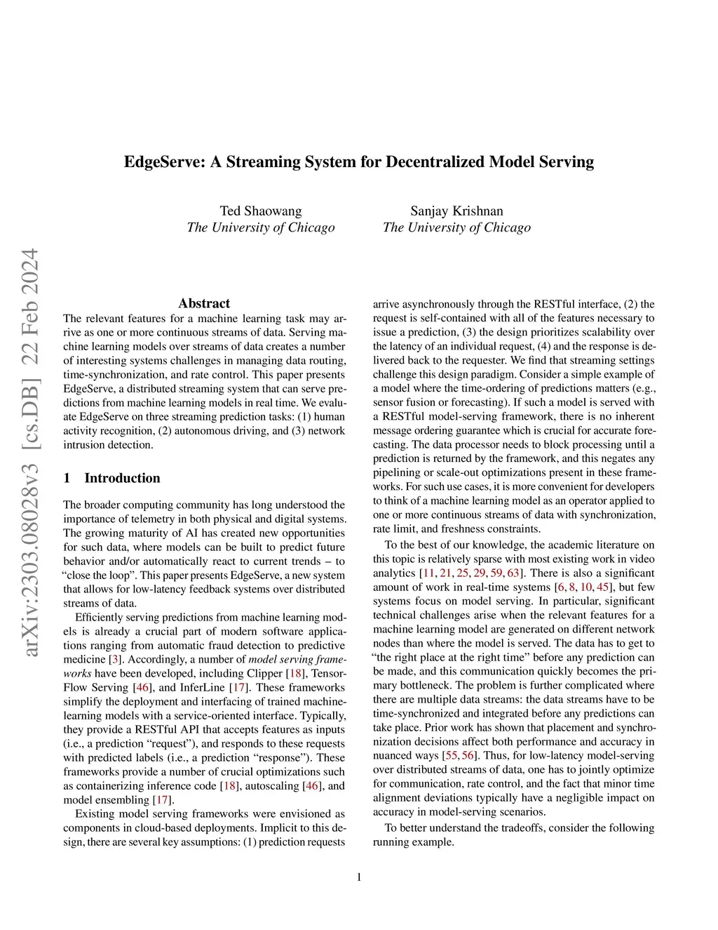 The relevant features for a machine learning task may arrive as one or more continuous streams of data. Serving machine learning models over streams of data creates a number of interesting systems challenges in managing data routing, time-synchronization, and rate control. This paper presents EdgeServe, a distributed streaming system that can serve predictions from machine learning models in real time. We evaluate EdgeServe on three streaming prediction tasks: (1) human activity recognition, (2) autonomous driving, and (3) network intrusion detection.