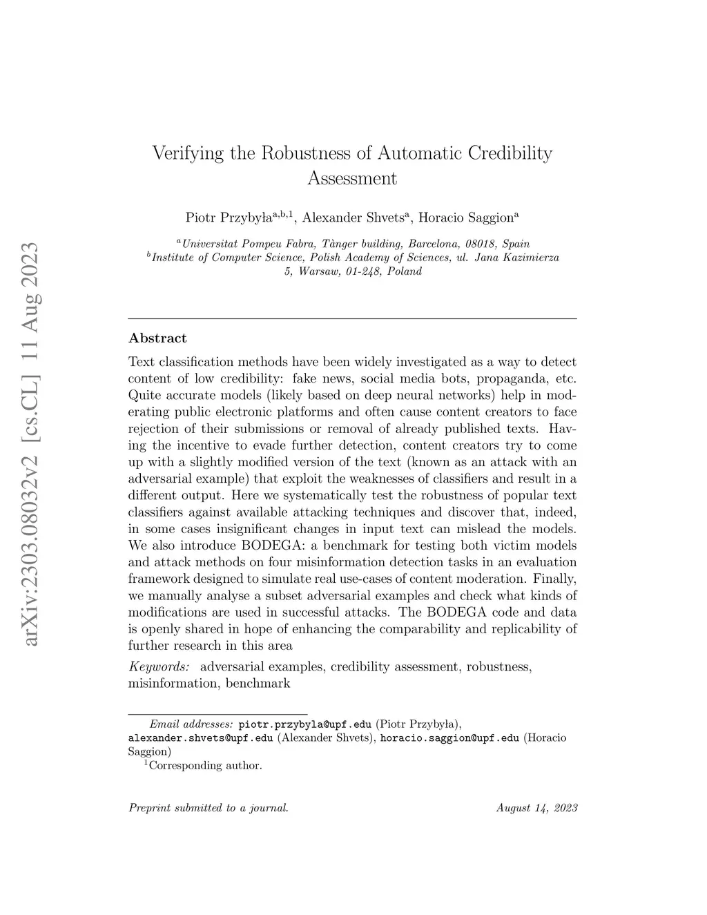 Text classification methods have been widely investigated as a way to detect content of low credibility: fake news, social media bots, propaganda, etc. Quite accurate models (likely based on deep neural networks) help in moderating public electronic platforms and often cause content creators to face rejection of their submissions or removal of already published texts. Having the incentive to evade further detection, content creators try to come up with a slightly modified version of the text (known as an attack with an adversarial example) that exploit the weaknesses of classifiers and result in a different output. Here we introduce BODEGA: a benchmark for testing both victim models and attack methods on four misinformation detection tasks in an evaluation framework designed to simulate real use-cases of content moderation. We also systematically test the robustness of popular text classifiers against available attacking techniques and discover that, indeed, in some cases barely significant changes in input text can mislead the models. We openly share the BODEGA code and data in hope of enhancing the comparability and replicability of further research in this area.