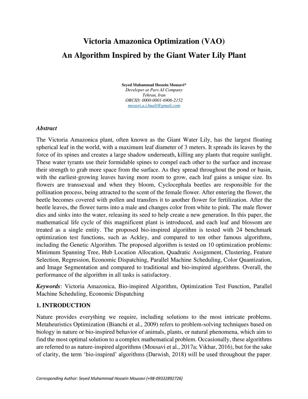 The Victoria Amazonica plant, often known as the Giant Water Lily, has the largest floating spherical leaf in the world, with a maximum leaf diameter of 3 meters. It spreads its leaves by the force of its spines and creates a large shadow underneath, killing any plants that require sunlight. These water tyrants use their formidable spines to compel each other to the surface and increase their strength to grab more space from the surface. As they spread throughout the pond or basin, with the earliest-growing leaves having more room to grow, each leaf gains a unique size. Its flowers are transsexual and when they bloom, Cyclocephala beetles are responsible for the pollination process, being attracted to the scent of the female flower. After entering the flower, the beetle becomes covered with pollen and transfers it to another flower for fertilization. After the beetle leaves, the flower turns into a male and changes color from white to pink. The male flower dies and sinks into the water, releasing its seed to help create a new generation. In this paper, the mathematical life cycle of this magnificent plant is introduced, and each leaf and blossom are treated as a single entity. The proposed bio-inspired algorithm is tested with 24 benchmark optimization test functions, such as Ackley, and compared to ten other famous algorithms, including the Genetic Algorithm. The proposed algorithm is tested on 10 optimization problems: Minimum Spanning Tree, Hub Location Allocation, Quadratic Assignment, Clustering, Feature Selection, Regression, Economic Dispatching, Parallel Machine Scheduling, Color Quantization, and Image Segmentation and compared to traditional and bio-inspired algorithms. Overall, the performance of the algorithm in all tasks is satisfactory.
