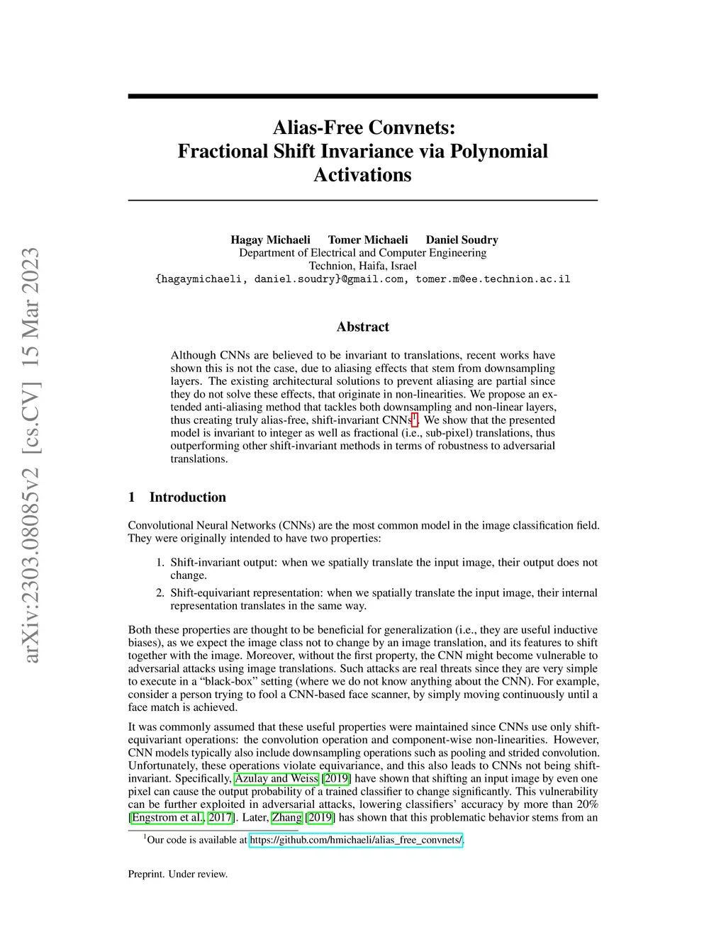 Although CNNs are believed to be invariant to translations, recent works have shown this is not the case, due to aliasing effects that stem from downsampling layers. The existing architectural solutions to prevent aliasing are partial since they do not solve these effects, that originate in non-linearities. We propose an extended anti-aliasing method that tackles both downsampling and non-linear layers, thus creating truly alias-free, shift-invariant CNNs. We show that the presented model is invariant to integer as well as fractional (i.e., sub-pixel) translations, thus outperforming other shift-invariant methods in terms of robustness to adversarial translations.