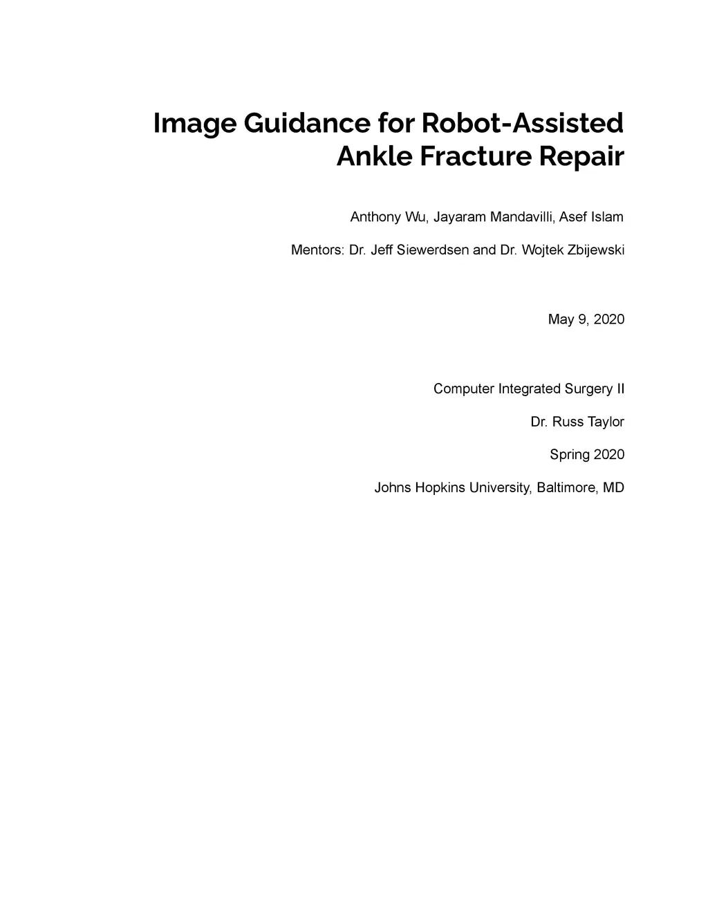 This project concerns developing and validating an image guidance framework for application to a robotic-assisted fibular reduction in ankle fracture surgery. The aim is to produce and demonstrate proper functioning of software for automatic determination of directions for fibular repositioning with the ultimate goal of application to a robotic reduction procedure that can reduce the time and complexity of the procedure as well as provide the benefits of reduced error in ideal final fibular position, improved syndesmosis restoration and reduced incidence of post-traumatic osteoarthritis. The focus of this product will be developing and testing the image guidance software, from the input of preoperative images through the steps of automated segmentation and registration until the output of a final transformation that can be used as instructions to a robot on how to reposition the fibula, but will not involve developing or implementing the hardware of the robot itself.