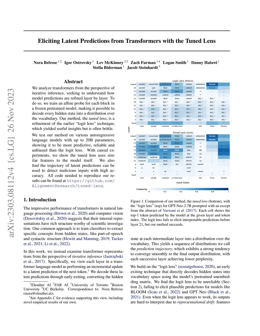 We analyze transformers from the perspective of iterative inference, seeking to understand how model predictions are refined layer by layer. To do so, we train an affine probe for each block in a frozen pretrained model, making it possible to decode every hidden state into a distribution over the vocabulary. Our method, the tuned lens, is a refinement of the earlier "logit lens" technique, which yielded useful insights but is often brittle.We test our method on various autoregressive language models with up to 20B parameters, showing it to be more predictive, reliable and unbiased than the logit lens. With causal experiments, we show the tuned lens uses similar features to the model itself. We also find the trajectory of latent predictions can be used to detect malicious inputs with high accuracy. All code needed to reproduce our results can be found atthis https URL.