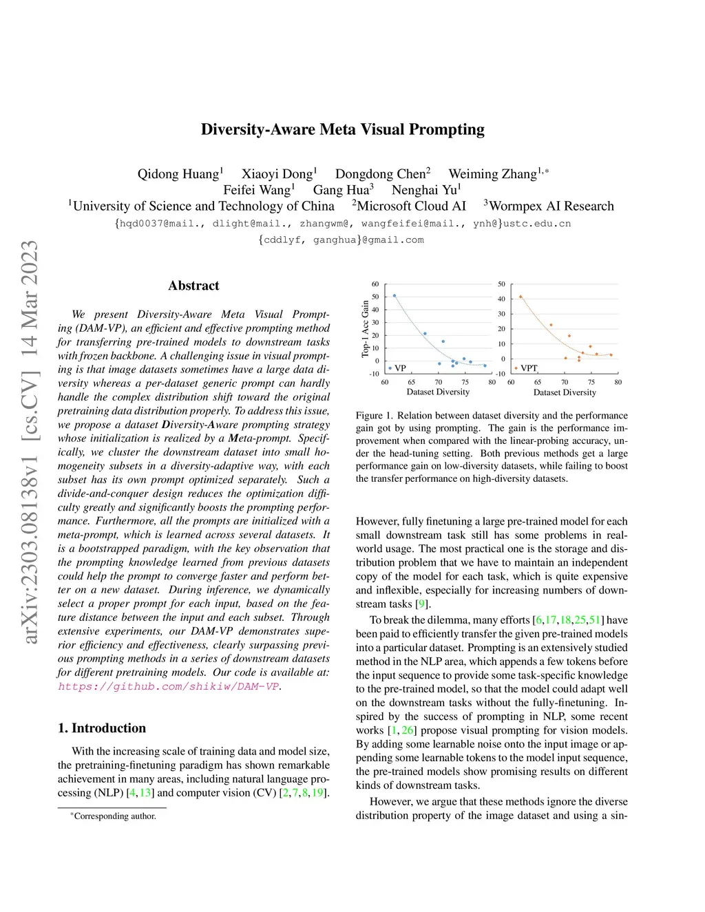 We present Diversity-Aware Meta Visual Prompting~(DAM-VP), an efficient and effective prompting method for transferring pre-trained models to downstream tasks with frozen backbone. A challenging issue in visual prompting is that image datasets sometimes have a large data diversity whereas a per-dataset generic prompt can hardly handle the complex distribution shift toward the original pretraining data distribution properly. To address this issue, we propose a dataset Diversity-Aware prompting strategy whose initialization is realized by a Meta-prompt. Specifically, we cluster the downstream dataset into small homogeneity subsets in a diversity-adaptive way, with each subset has its own prompt optimized separately. Such a divide-and-conquer design reduces the optimization difficulty greatly and significantly boosts the prompting performance. Furthermore, all the prompts are initialized with a meta-prompt, which is learned across several datasets. It is a bootstrapped paradigm, with the key observation that the prompting knowledge learned from previous datasets could help the prompt to converge faster and perform better on a new dataset. During inference, we dynamically select a proper prompt for each input, based on the feature distance between the input and each subset. Through extensive experiments, our DAM-VP demonstrates superior efficiency and effectiveness, clearly surpassing previous prompting methods in a series of downstream datasets for different pretraining models. Our code is available at: \url{https://github.com/shikiw/DAM-VP}.