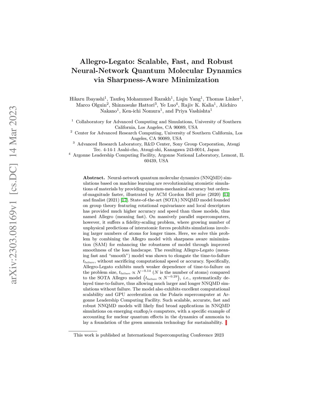 Neural-network quantum molecular dynamics (NNQMD) simulations based on machine learning are revolutionizing atomistic simulations of materials by providing quantum-mechanical accuracy but orders-of-magnitude faster, illustrated by ACM Gordon Bell prize (2020) and finalist (2021). State-of-the-art (SOTA) NNQMD model founded on group theory featuring rotational equivariance and local descriptors has provided much higher accuracy and speed than those models, thus named Allegro (meaning fast). On massively parallel supercomputers, however, it suffers a fidelity-scaling problem, where growing number of unphysical predictions of interatomic forces prohibits simulations involving larger numbers of atoms for longer times. Here, we solve this problem by combining the Allegro model with sharpness aware minimization (SAM) for enhancing the robustness of model through improved smoothness of the loss landscape. The resulting Allegro-Legato (meaning fast and "smooth") model was shown to elongate the time-to-failure , without sacrificing computational speed or accuracy. Specifically, Allegro-Legato exhibits much weaker dependence of timei-to-failure on the problem size, ( is the number of atoms) compared to the SOTA Allegro model , i.e., systematically delayed time-to-failure, thus allowing much larger and longer NNQMD simulations without failure. The model also exhibits excellent computational scalability and GPU acceleration on the Polaris supercomputer at Argonne Leadership Computing Facility. Such scalable, accurate, fast and robust NNQMD models will likely find broad applications in NNQMD simulations on emerging exaflop/s computers, with a specific example of accounting for nuclear quantum effects in the dynamics of ammonia.