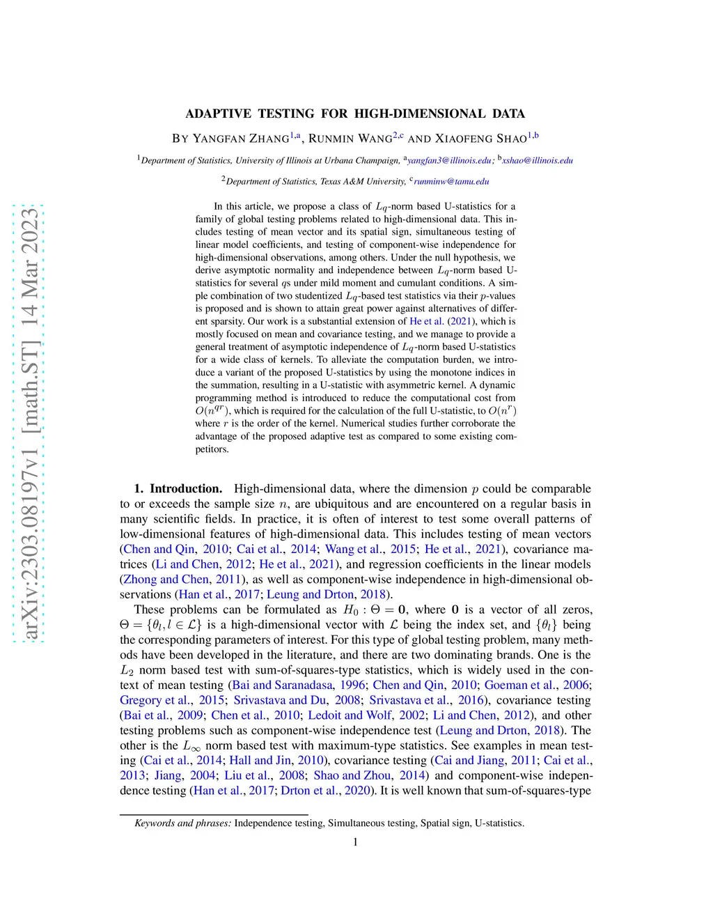 In this article, we propose a class of -norm based U-statistics for a family of global testing problems related to high-dimensional data. This includes testing of mean vector and its spatial sign, simultaneous testing of linear model coefficients, and testing of component-wise independence for high-dimensional observations, among others. Under the null hypothesis, we derive asymptotic normality and independence between -norm based U-statistics for several s under mild moment and cumulant conditions. A simple combination of two studentized -based test statistics via their -values is proposed and is shown to attain great power against alternatives of different sparsity. Our work is a substantial extension of He et al. (2021), which is mostly focused on mean and covariance testing, and we manage to provide a general treatment of asymptotic independence of -norm based U-statistics for a wide class of kernels. To alleviate the computation burden, we introduce a variant of the proposed U-statistics by using the monotone indices in the summation, resulting in a U-statistic with asymmetric kernel. A dynamic programming method is introduced to reduce the computational cost from , which is required for the calculation of the full U-statistic, to where is the order of the kernel. Numerical studies further corroborate the advantage of the proposed adaptive test as compared to some existing competitors.