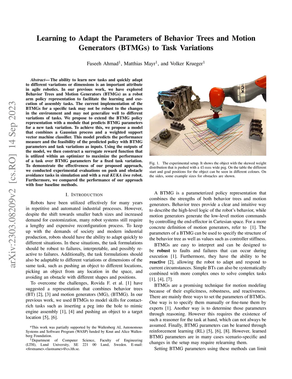 The ability to learn new tasks and quickly adapt to different variations or dimensions is an important attribute in agile robotics. In our previous work, we have explored Behavior Trees and Motion Generators (BTMGs) as a robot arm policy representation to facilitate the learning and execution of assembly tasks. The current implementation of the BTMGs for a specific task may not be robust to the changes in the environment and may not generalize well to different variations of tasks. We propose to extend the BTMG policy representation with a module that predicts BTMG parameters for a new task variation. To achieve this, we propose a model that combines a Gaussian process and a weighted support vector machine classifier. This model predicts the performance measure and the feasibility of the predicted policy with BTMG parameters and task variations as inputs. Using the outputs of the model, we then construct a surrogate reward function that is utilized within an optimizer to maximize the performance of a task over BTMG parameters for a fixed task variation. To demonstrate the effectiveness of our proposed approach, we conducted experimental evaluations on push and obstacle avoidance tasks in simulation and with a real KUKA iiwa robot. Furthermore, we compared the performance of our approach with four baseline methods.