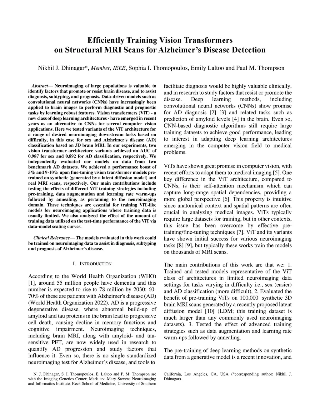 Neuroimaging of large populations is valuable to identify factors that promote or resist brain disease, and to assist diagnosis, subtyping, and prognosis. Data-driven models such as convolutional neural networks (CNNs) have increasingly been applied to brain images to perform diagnostic and prognostic tasks by learning robust features. Vision transformers (ViT) - a new class of deep learning architectures - have emerged in recent years as an alternative to CNNs for several computer vision applications. Here we tested variants of the ViT architecture for a range of desired neuroimaging downstream tasks based on difficulty, in this case for sex and Alzheimer's disease (AD) classification based on 3D brain MRI. In our experiments, two vision transformer architecture variants achieved an AUC of 0.987 for sex and 0.892 for AD classification, respectively. We independently evaluated our models on data from two benchmark AD datasets. We achieved a performance boost of 5% and 9-10% upon fine-tuning vision transformer models pre-trained on synthetic (generated by a latent diffusion model) and real MRI scans, respectively. Our main contributions include testing the effects of different ViT training strategies including pre-training, data augmentation and learning rate warm-ups followed by annealing, as pertaining to the neuroimaging domain. These techniques are essential for training ViT-like models for neuroimaging applications where training data is usually limited. We also analyzed the effect of the amount of training data utilized on the test-time performance of the ViT via data-model scaling curves.