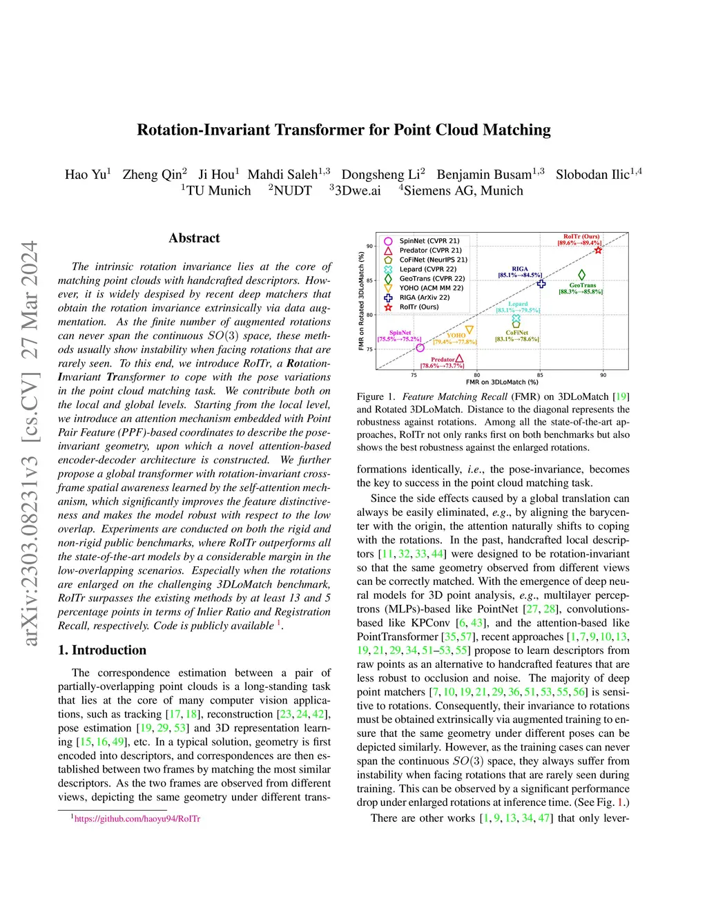 The intrinsic rotation invariance lies at the core of matching point clouds with handcrafted descriptors. However, it is widely despised by recent deep matchers that obtain the rotation invariance extrinsically via data augmentation. As the finite number of augmented rotations can never span the continuous SO(3) space, these methods usually show instability when facing rotations that are rarely seen. To this end, we introduce RoITr, a Rotation-Invariant Transformer to cope with the pose variations in the point cloud matching task. We contribute both on the local and global levels. Starting from the local level, we introduce an attention mechanism embedded with Point Pair Feature (PPF)-based coordinates to describe the pose-invariant geometry, upon which a novel attention-based encoder-decoder architecture is constructed. We further propose a global transformer with rotation-invariant cross-frame spatial awareness learned by the self-attention mechanism, which significantly improves the feature distinctiveness and makes the model robust with respect to the low overlap. Experiments are conducted on both the rigid and non-rigid public benchmarks, where RoITr outperforms all the state-of-the-art models by a considerable margin in the low-overlapping scenarios. Especially when the rotations are enlarged on the challenging 3DLoMatch benchmark, RoITr surpasses the existing methods by at least 13 and 5 percentage points in terms of Inlier Ratio and Registration Recall, respectively.