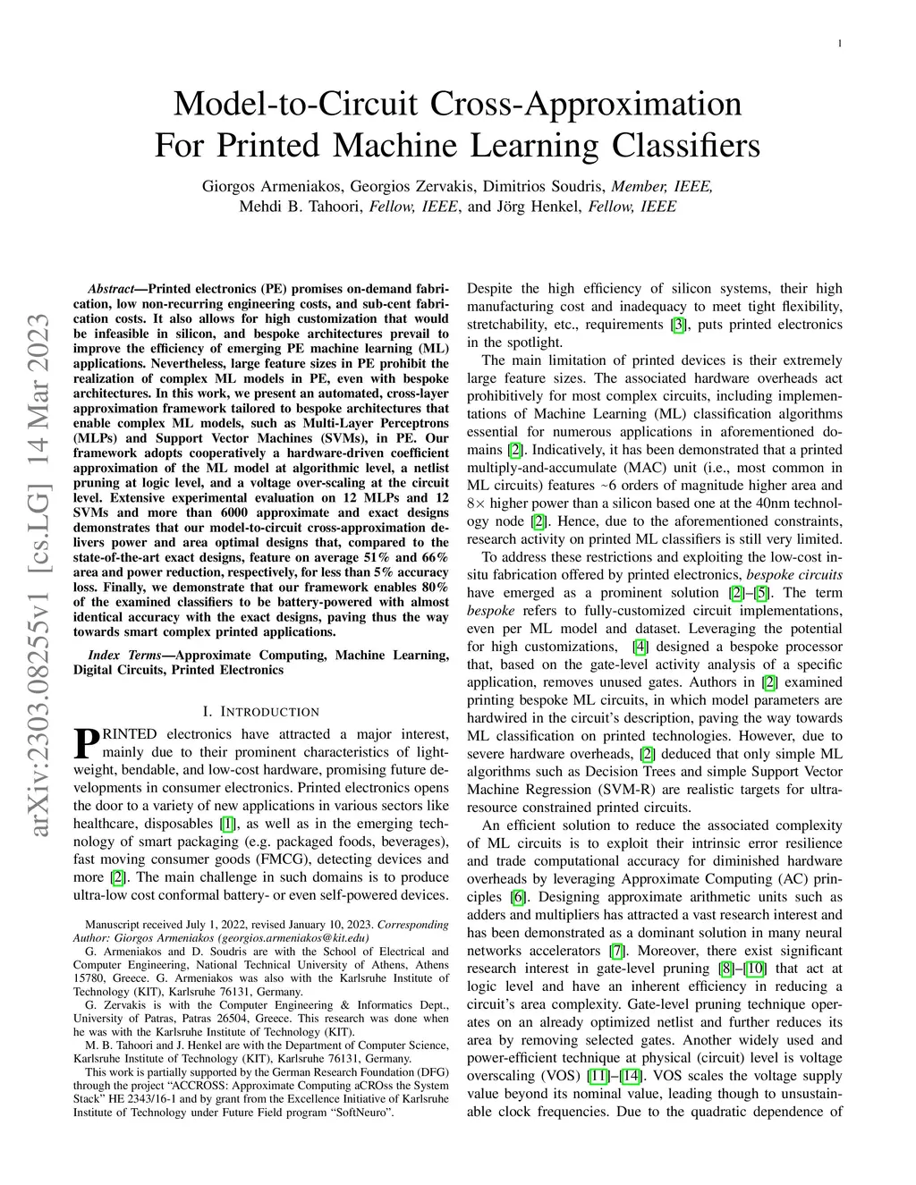 Printed electronics (PE) promises on-demand fabrication, low non-recurring engineering costs, and sub-cent fabrication costs. It also allows for high customization that would be infeasible in silicon, and bespoke architectures prevail to improve the efficiency of emerging PE machine learning (ML) applications. Nevertheless, large feature sizes in PE prohibit the realization of complex ML models in PE, even with bespoke architectures. In this work, we present an automated, cross-layer approximation framework tailored to bespoke architectures that enable complex ML models, such as Multi-Layer Perceptrons (MLPs) and Support Vector Machines (SVMs), in PE. Our framework adopts cooperatively a hardware-driven coefficient approximation of the ML model at algorithmic level, a netlist pruning at logic level, and a voltage over-scaling at the circuit level. Extensive experimental evaluation on 12 MLPs and 12 SVMs and more than 6000 approximate and exact designs demonstrates that our model-to-circuit cross-approximation delivers power and area optimal designs that, compared to the state-of-the-art exact designs, feature on average 51% and 66% area and power reduction, respectively, for less than 5% accuracy loss. Finally, we demonstrate that our framework enables 80% of the examined classifiers to be battery-powered with almost identical accuracy with the exact designs, paving thus the way towards smart complex printed applications.