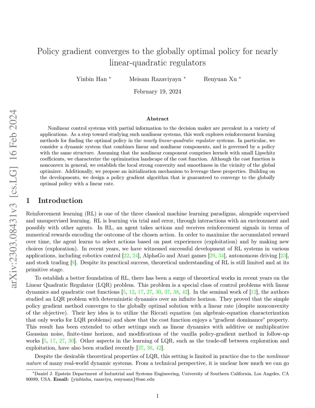 Policy Gradient Converges to the Globally Optimal Policy for Nearly Linear-Quadratic Regulators