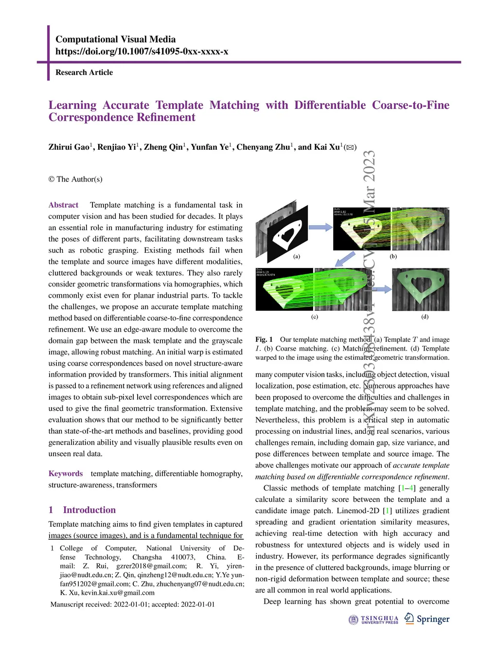 Template matching is a fundamental task in computer vision and has been studied for decades. It plays an essential role in manufacturing industry for estimating the poses of different parts, facilitating downstream tasks such as robotic grasping. Existing methods fail when the template and source images have different modalities, cluttered backgrounds or weak textures. They also rarely consider geometric transformations via homographies, which commonly exist even for planar industrial parts. To tackle the challenges, we propose an accurate template matching method based on differentiable coarse-to-fine correspondence refinement. We use an edge-aware module to overcome the domain gap between the mask template and the grayscale image, allowing robust matching. An initial warp is estimated using coarse correspondences based on novel structure-aware information provided by transformers. This initial alignment is passed to a refinement network using references and aligned images to obtain sub-pixel level correspondences which are used to give the final geometric transformation. Extensive evaluation shows that our method is significantly better than state-of-the-art methods and baselines, providing good generalization ability and visually plausible results even on unseen real data.