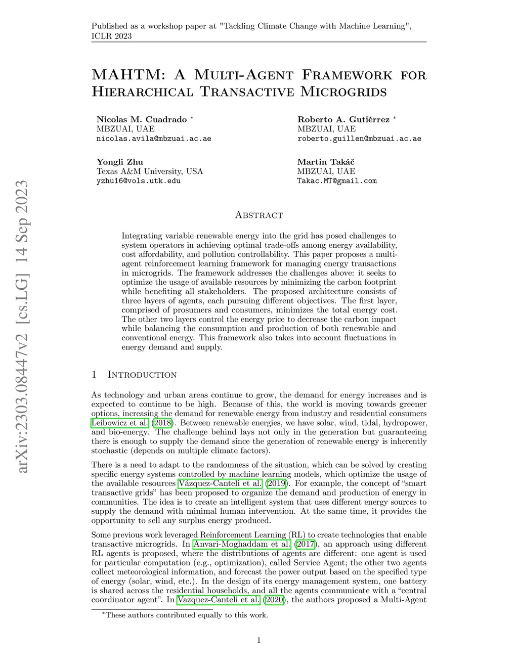 Integrating variable renewable energy into the grid has posed challenges to system operators in achieving optimal trade-offs among energy availability, cost affordability, and pollution controllability. This paper proposes a multi-agent reinforcement learning framework for managing energy transactions in microgrids. The framework addresses the challenges above: it seeks to optimize the usage of available resources by minimizing the carbon footprint while benefiting all stakeholders. The proposed architecture consists of three layers of agents, each pursuing different objectives. The first layer, comprised of prosumers and consumers, minimizes the total energy cost. The other two layers control the energy price to decrease the carbon impact while balancing the consumption and production of both renewable and conventional energy. This framework also takes into account fluctuations in energy demand and supply.
