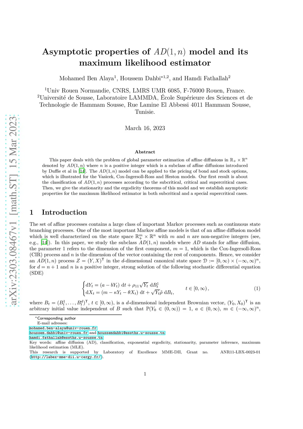 This paper deals with the problem of global parameter estimation of affine diffusions in denoted by where is a positive integer which is a subclass of affine diffusions introduced by Duffie et al in [14]. The model can be applied to the pricing of bond and stock options, which is illustrated for the Vasicek, Cox-Ingersoll-Ross and Heston models. Our first result is about the classification of processes according to the subcritical, critical and supercritical cases. Then, we give the stationarity and the ergodicity theorems of this model and we establish asymptotic properties for the maximum likelihood estimator in both subcritical and a special supercritical cases.