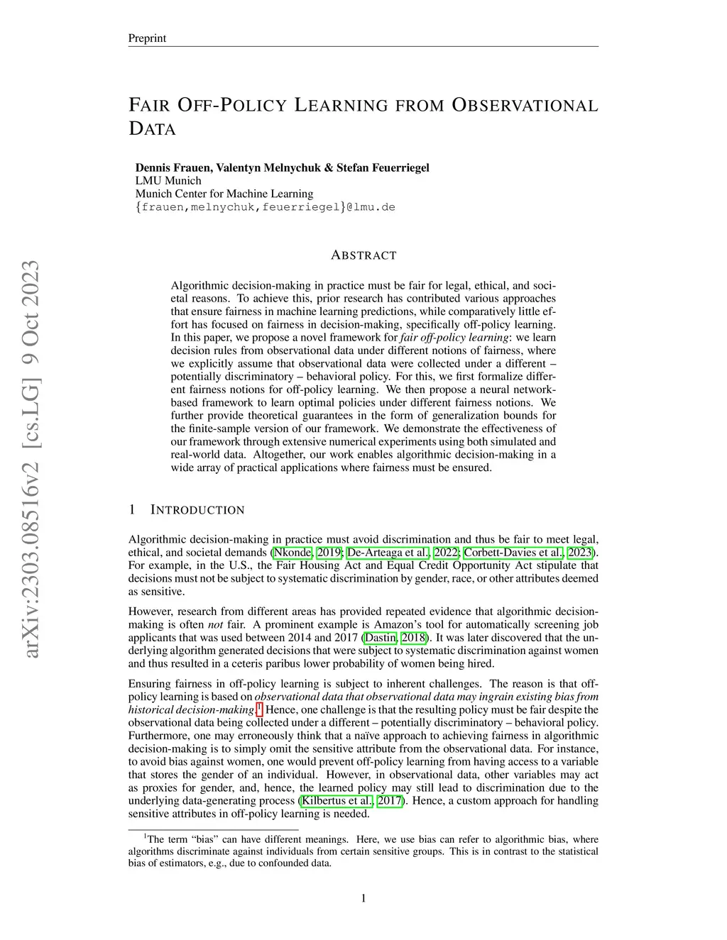 Algorithmic decision-making in practice must be fair for legal, ethical, and societal reasons. To achieve this, prior research has contributed various approaches that ensure fairness in machine learning predictions, while comparatively little effort has focused on fairness in decision-making, specifically off-policy learning. In this paper, we propose a novel framework for fair off-policy learning: we learn decision rules from observational data under different notions of fairness, where we explicitly assume that observational data were collected under a different potentially discriminatory behavioral policy. For this, we first formalize different fairness notions for off-policy learning. We then propose a neural network-based framework to learn optimal policies under different fairness notions. We further provide theoretical guarantees in the form of generalization bounds for the finite-sample version of our framework. We demonstrate the effectiveness of our framework through extensive numerical experiments using both simulated and real-world data. Altogether, our work enables algorithmic decision-making in a wide array of practical applications where fairness must be ensured.