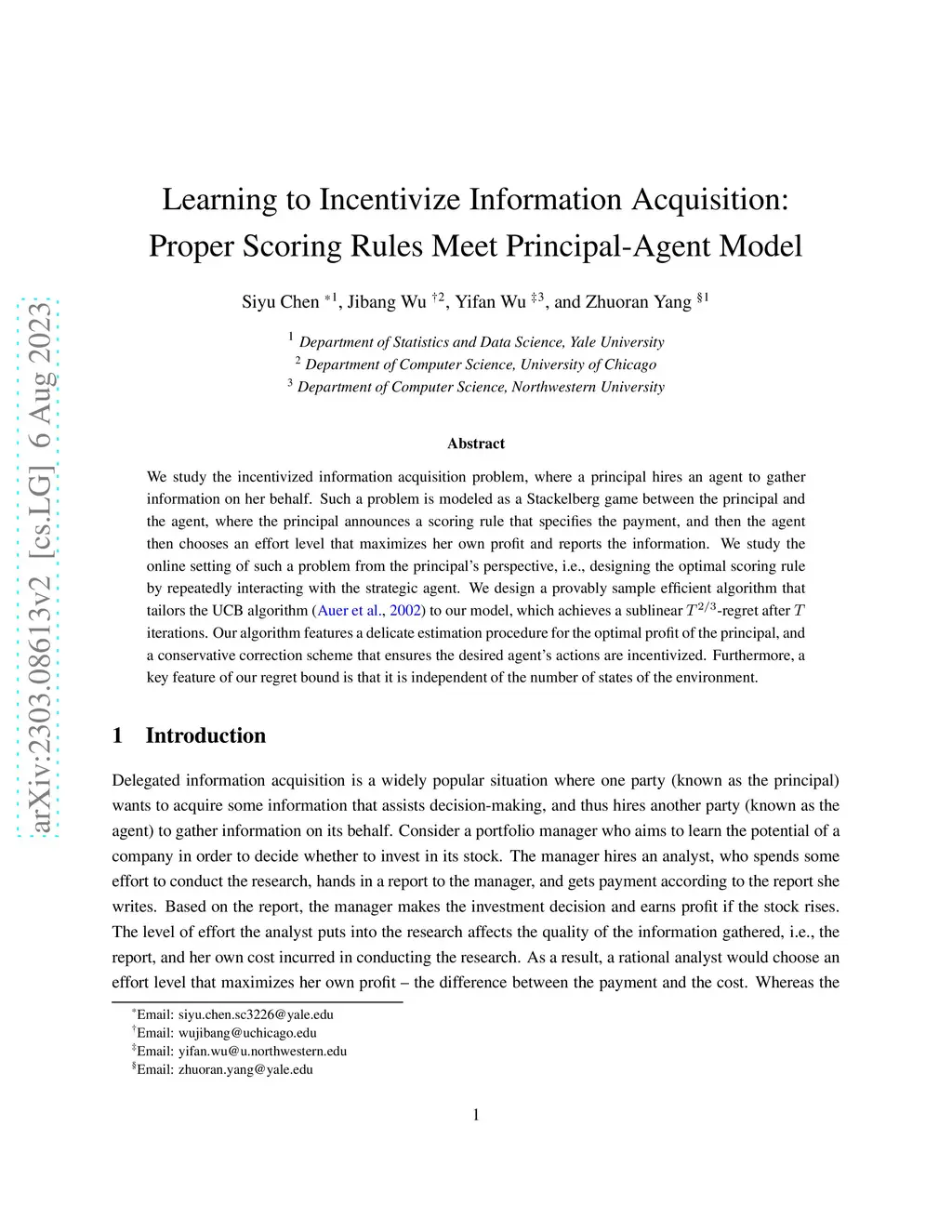 We study the incentivized information acquisition problem, where a principal hires an agent to gather information on her behalf. Such a problem is modeled as a Stackelberg game between the principal and the agent, where the principal announces a scoring rule that specifies the payment, and then the agent then chooses an effort level that maximizes her own profit and reports the information. We study the online setting of such a problem from the principal's perspective, i.e., designing the optimal scoring rule by repeatedly interacting with the strategic agent. We design a provably sample efficient algorithm that tailors the UCB algorithm (Auer et al., 2002) to our model, which achieves a sublinear -regret after iterations. Our algorithm features a delicate estimation procedure for the optimal profit of the principal, and a conservative correction scheme that ensures the desired agent's actions are incentivized. Furthermore, a key feature of our regret bound is that it is independent of the number of states of the environment.