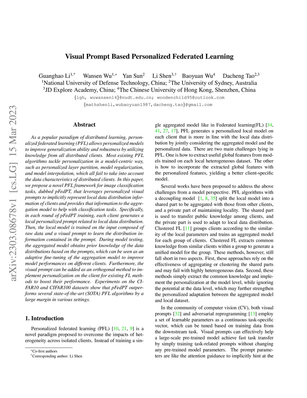 As a popular paradigm of distributed learning, personalized federated learning (PFL) allows personalized models to improve generalization ability and robustness by utilizing knowledge from all distributed clients. Most existing PFL algorithms tackle personalization in a model-centric way, such as personalized layer partition, model regularization, and model interpolation, which all fail to take into account the data characteristics of distributed clients. In this paper, we propose a novel PFL framework for image classification tasks, dubbed pFedPT, that leverages personalized visual prompts to implicitly represent local data distribution information of clients and provides that information to the aggregation model to help with classification tasks. Specifically, in each round of pFedPT training, each client generates a local personalized prompt related to local data distribution. Then, the local model is trained on the input composed of raw data and a visual prompt to learn the distribution information contained in the prompt. During model testing, the aggregated model obtains prior knowledge of the data distributions based on the prompts, which can be seen as an adaptive fine-tuning of the aggregation model to improve model performances on different clients. Furthermore, the visual prompt can be added as an orthogonal method to implement personalization on the client for existing FL methods to boost their performance. Experiments on the CIFAR10 and CIFAR100 datasets show that pFedPT outperforms several state-of-the-art (SOTA) PFL algorithms by a large margin in various settings.