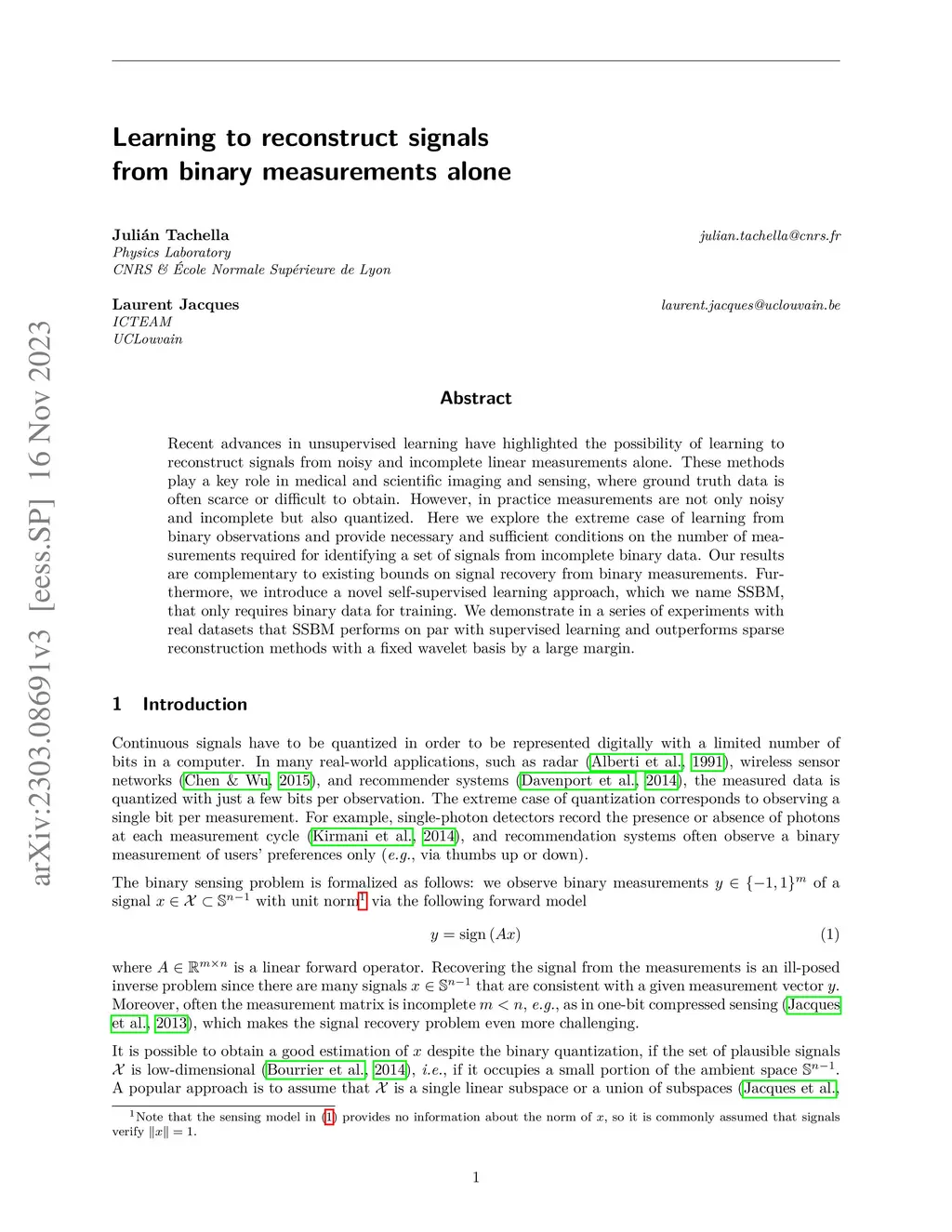 Recent advances in unsupervised learning have highlighted the possibility of learning to reconstruct signals from noisy and incomplete linear measurements alone. These methods play a key role in medical and scientific imaging and sensing, where ground truth data is often scarce or difficult to obtain. However, in practice, measurements are not only noisy and incomplete but also quantized. Here we explore the extreme case of learning from binary observations and provide necessary and sufficient conditions on the number of measurements required for identifying a set of signals from incomplete binary data. Our results are complementary to existing bounds on signal recovery from binary measurements. Furthermore, we introduce a novel self-supervised learning approach, which we name SSBM, that only requires binary data for training. We demonstrate in a series of experiments with real datasets that SSBM performs on par with supervised learning and outperforms sparse reconstruction methods with a fixed wavelet basis by a large margin.