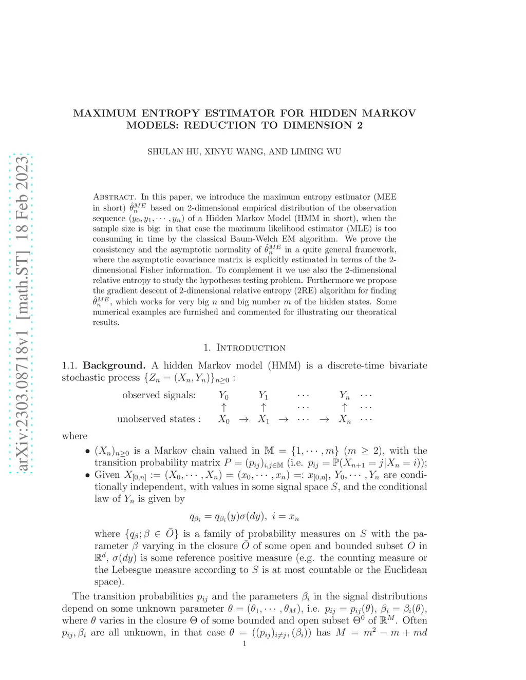 In the paper, we introduce the maximum entropy estimator based on 2-dimensional empirical distribution of the observation sequence of hidden Markov model , when the sample size is big: in that case computing the maximum likelihood estimator is too consuming in time by the classical Baum-Welch EM algorithm. We prove the consistency and the asymptotic normality of the maximum entropy estimator in a quite general framework, where the asymptotic covariance matrix is explicitly estimated in terms of the 2-dimensional Fisher information. To complement it, the 2-dimensional relative entropy is skillfully used to study the hypotheses testing problem. Furthermore, we propose 2-dimensional maximum entropy algorithm for finding the maximum entropy estimator, which works for very large observation dataset and large hidden states set. Some numerical examples are furnished and commented for illustrating our theoretical results.