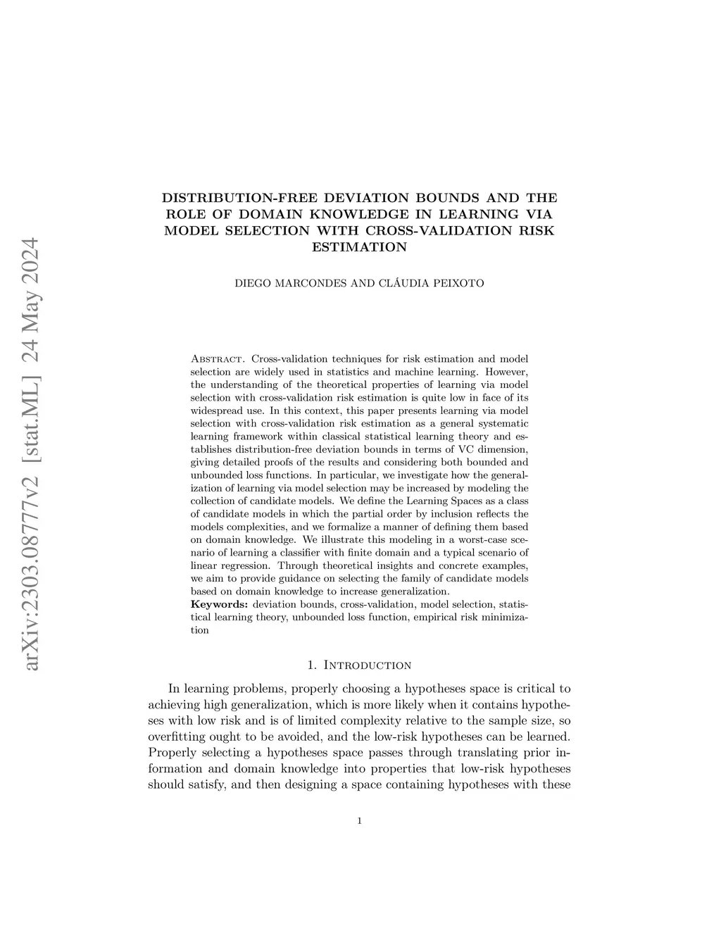 Cross-validation techniques for risk estimation and model selection are widely used in statistics and machine learning. However, the understanding of the theoretical properties of learning via model selection with cross-validation risk estimation is quite low in face of its widespread use. In this context, this paper presents learning via model selection with cross-validation risk estimation as a general systematic learning framework within classical statistical learning theory and establishes distribution-free deviation bounds in terms of VC dimension, giving detailed proofs of the results and considering both bounded and unbounded loss functions. In particular, we investigate how the generalization of learning via model selection may be increased by modeling the collection of candidate models. We define the Learning Spaces as a class of candidate models in which the partial order by inclusion reflects the models complexities, and we formalize a manner of defining them based on domain knowledge. We illustrate this modeling in a worst-case scenario of learning a classifier with finite domain and a typical scenario of linear regression. Through theoretical insights and concrete examples, we aim to provide guidance on selecting the family of candidate models based on domain knowledge to increase generalization.