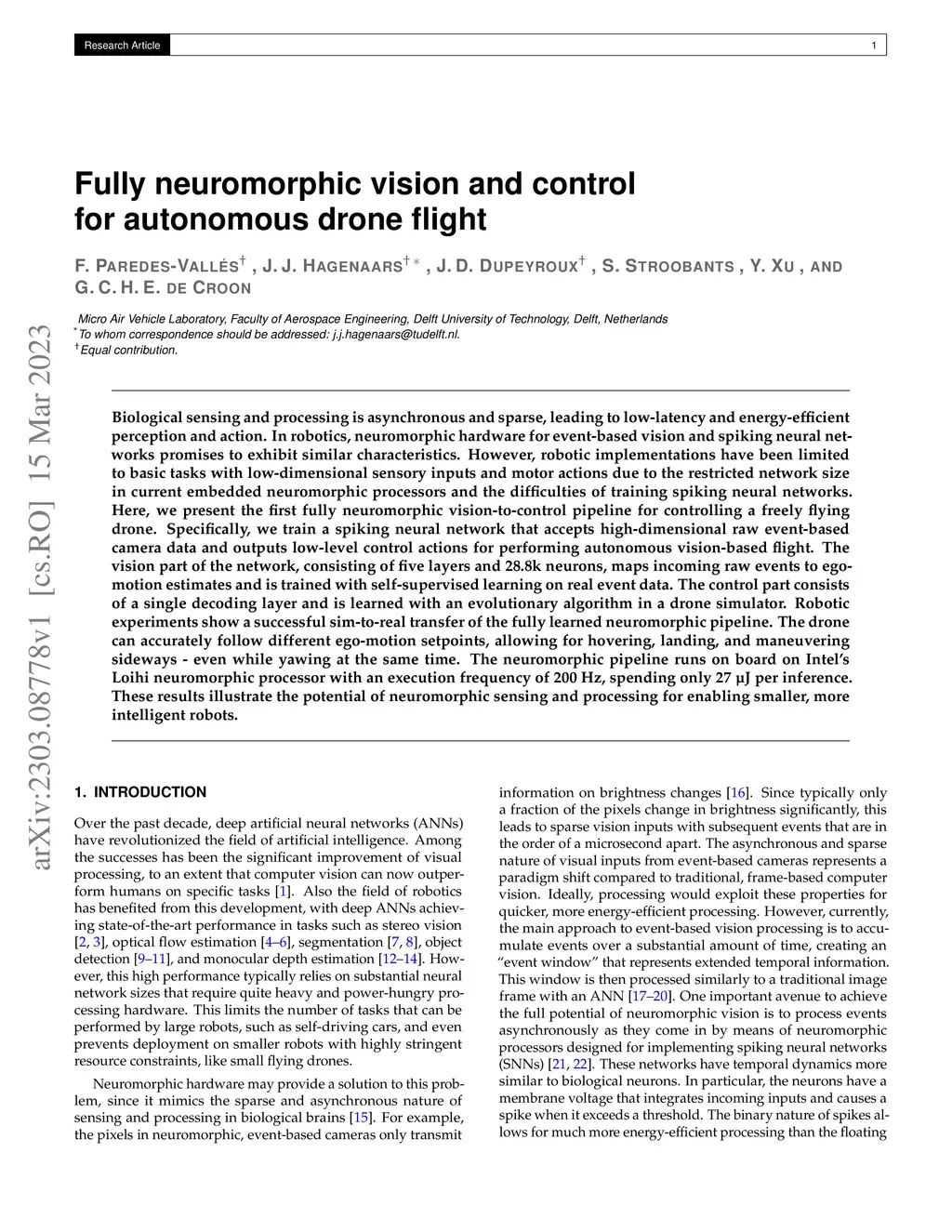 Biological sensing and processing is asynchronous and sparse, leading to low-latency and energy-efficient perception and action. In robotics, neuromorphic hardware for event-based vision and spiking neural networks promises to exhibit similar characteristics. However, robotic implementations have been limited to basic tasks with low-dimensional sensory inputs and motor actions due to the restricted network size in current embedded neuromorphic processors and the difficulties of training spiking neural networks. Here, we present the first fully neuromorphic vision-to-control pipeline for controlling a freely flying drone. Specifically, we train a spiking neural network that accepts high-dimensional raw event-based camera data and outputs low-level control actions for performing autonomous vision-based flight. The vision part of the network, consisting of five layers and 28.8k neurons, maps incoming raw events to ego-motion estimates and is trained with self-supervised learning on real event data. The control part consists of a single decoding layer and is learned with an evolutionary algorithm in a drone simulator. Robotic experiments show a successful sim-to-real transfer of the fully learned neuromorphic pipeline. The drone can accurately follow different ego-motion setpoints, allowing for hovering, landing, and maneuvering sidewayseven while yawing at the same time. The neuromorphic pipeline runs on board on Intel's Loihi neuromorphic processor with an execution frequency of 200 Hz, spending only 27 J per inference. These results illustrate the potential of neuromorphic sensing and processing for enabling smaller, more intelligent robots.