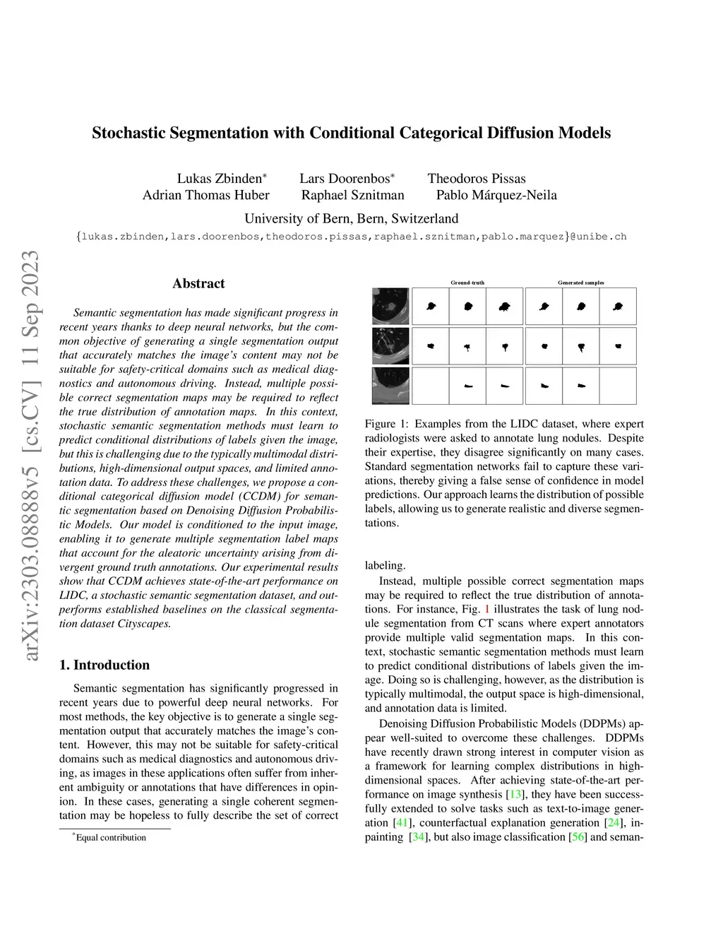 Semantic segmentation has made significant progress in recent years thanks to deep neural networks, but the common objective of generating a single segmentation output that accurately matches the image's content may not be suitable for safety-critical domains such as medical diagnostics and autonomous driving. Instead, multiple possible correct segmentation maps may be required to reflect the true distribution of annotation maps. In this context, stochastic semantic segmentation methods must learn to predict conditional distributions of labels given the image, but this is challenging due to the typically multimodal distributions, high-dimensional output spaces, and limited annotation data. To address these challenges, we propose a conditional categorical diffusion model (CCDM) for semantic segmentation based on Denoising Diffusion Probabilistic Models. Our model is conditioned to the input image, enabling it to generate multiple segmentation label maps that account for the aleatoric uncertainty arising from divergent ground truth annotations. Our experimental results show that CCDM achieves state-of-the-art performance on LIDC, a stochastic semantic segmentation dataset, and outperforms established baselines on the classical segmentation dataset Cityscapes.