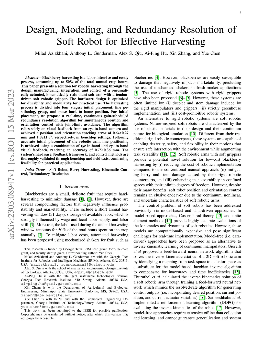 Blackberry harvesting is a labor-intensive and costly process, consuming up to 50\% of the total annual crop hours. This paper presents a solution for robotic harvesting through the design, manufacturing, integration, and control of a pneumatically actuated, kinematically redundant soft arm with a tendon-driven soft robotic gripper. The hardware design is optimized for durability and modularity for practical use. The harvesting process is divided into four stages: initial placement, fine positioning, grasp, and move back to home position. For initial placement, we propose a real-time, continuous gain-scheduled redundancy resolution algorithm for simultaneous position and orientation control with joint-limit avoidance. The algorithm relies solely on visual feedback from an eye-to-hand camera and achieved a position and orientation tracking error of mm and , respectively, in benchtop settings. Following accurate initial placement of the robotic arm, fine positioning is achieved using a combination of eye-in-hand and eye-to-hand visual feedback, reaching an accuracy of mm. The system's hardware, feedback framework, and control methods are thoroughly validated through benchtop and field tests, confirming feasibility for practical applications.