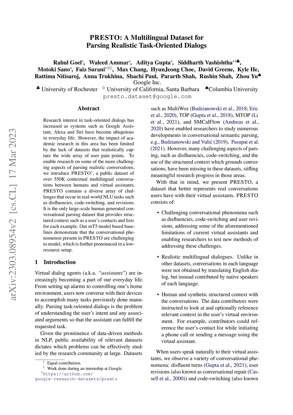 Research interest in task-oriented dialogs has increased as systems such as Google Assistant, Alexa and Siri have become ubiquitous in everyday life. However, the impact of academic research in this area has been limited by the lack of datasets that realistically capture the wide array of user pain points. To enable research on some of the more challenging aspects of parsing realistic conversations, we introduce PRESTO, a public dataset of over 550K contextual multilingual conversations between humans and virtual assistants. PRESTO contains a diverse array of challenges that occur in real-world NLU tasks such as disfluencies, code-switching, and revisions. It is the only large scale human generated conversational parsing dataset that provides structured context such as a user's contacts and lists for each example. Our mT5 model based baselines demonstrate that the conversational phenomenon present in PRESTO are challenging to model, which is further pronounced in a low-resource setup.