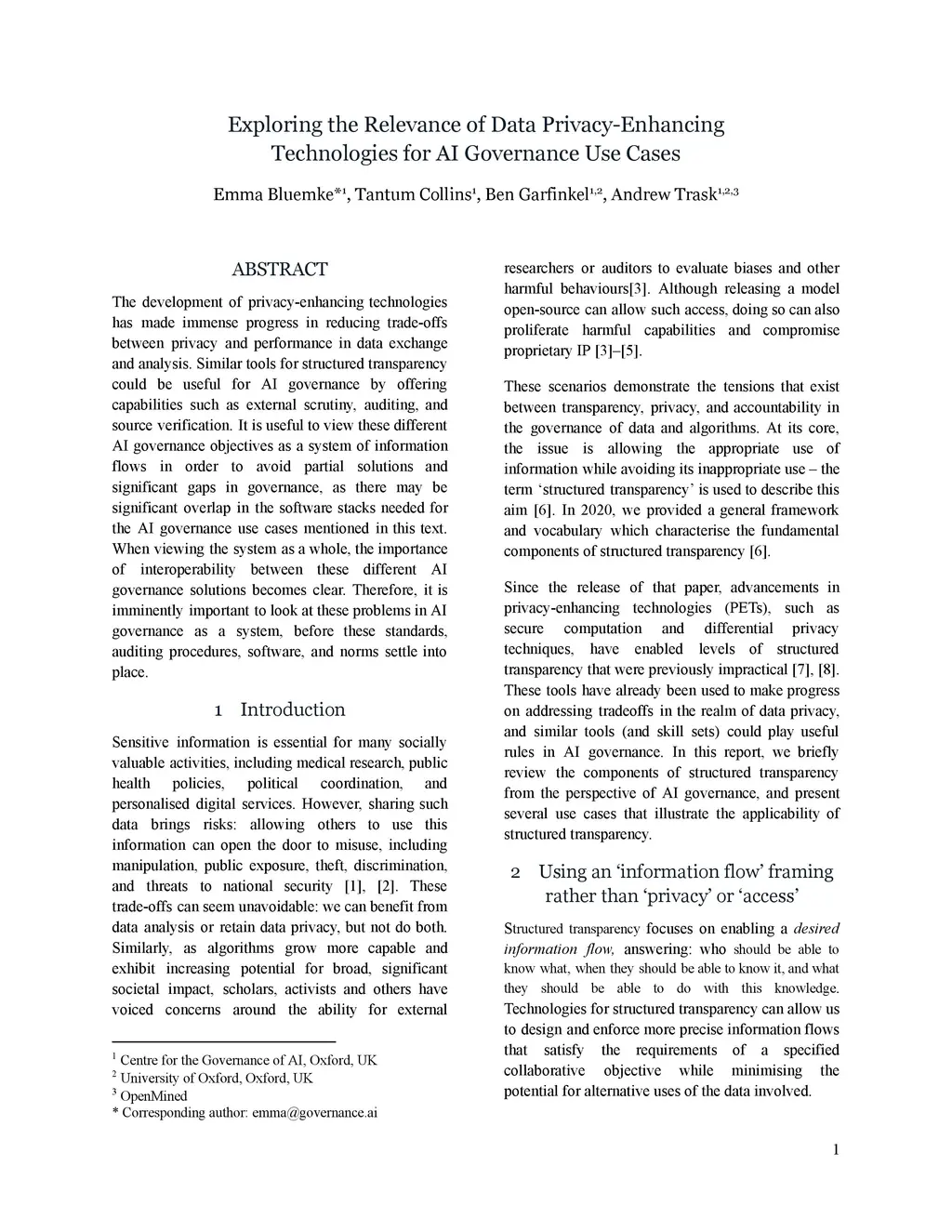 The development of privacy-enhancing technologies has made immense progress in reducing trade-offs between privacy and performance in data exchange and analysis. Similar tools for structured transparency could be useful for AI governance by offering capabilities such as external scrutiny, auditing, and source verification. It is useful to view these different AI governance objectives as a system of information flows in order to avoid partial solutions and significant gaps in governance, as there may be significant overlap in the software stacks needed for the AI governance use cases mentioned in this text. When viewing the system as a whole, the importance of interoperability between these different AI governance solutions becomes clear. Therefore, it is imminently important to look at these problems in AI governance as a system, before these standards, auditing procedures, software, and norms settle into place.