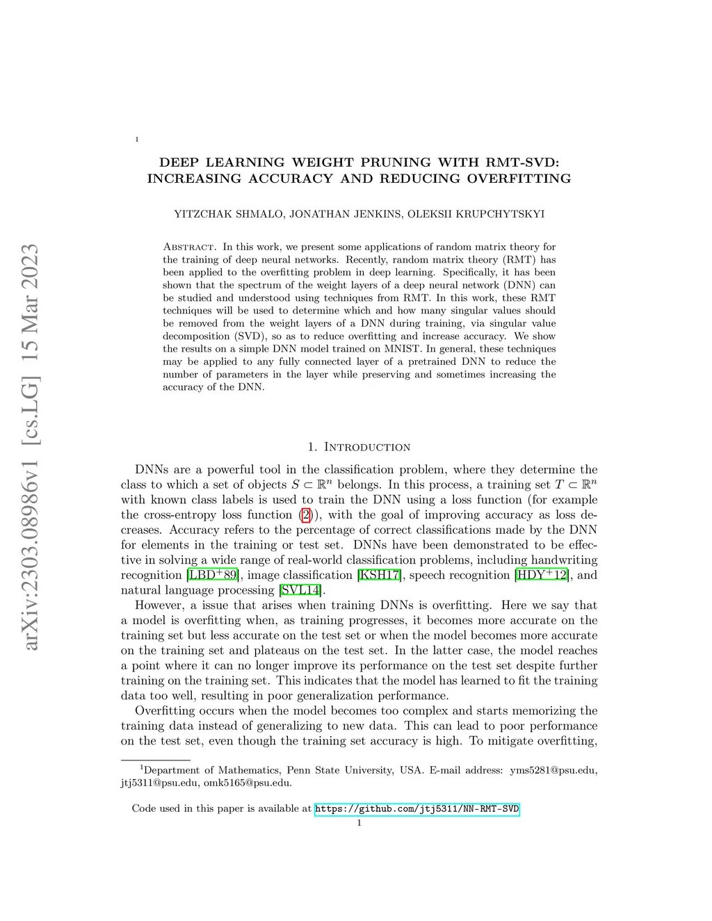 In this work, we present some applications of random matrix theory for the training of deep neural networks. Recently, random matrix theory (RMT) has been applied to the overfitting problem in deep learning. Specifically, it has been shown that the spectrum of the weight layers of a deep neural network (DNN) can be studied and understood using techniques from RMT. In this work, these RMT techniques will be used to determine which and how many singular values should be removed from the weight layers of a DNN during training, via singular value decomposition (SVD), so as to reduce overfitting and increase accuracy. We show the results on a simple DNN model trained on MNIST. In general, these techniques may be applied to any fully connected layer of a pretrained DNN to reduce the number of parameters in the layer while preserving and sometimes increasing the accuracy of the DNN.