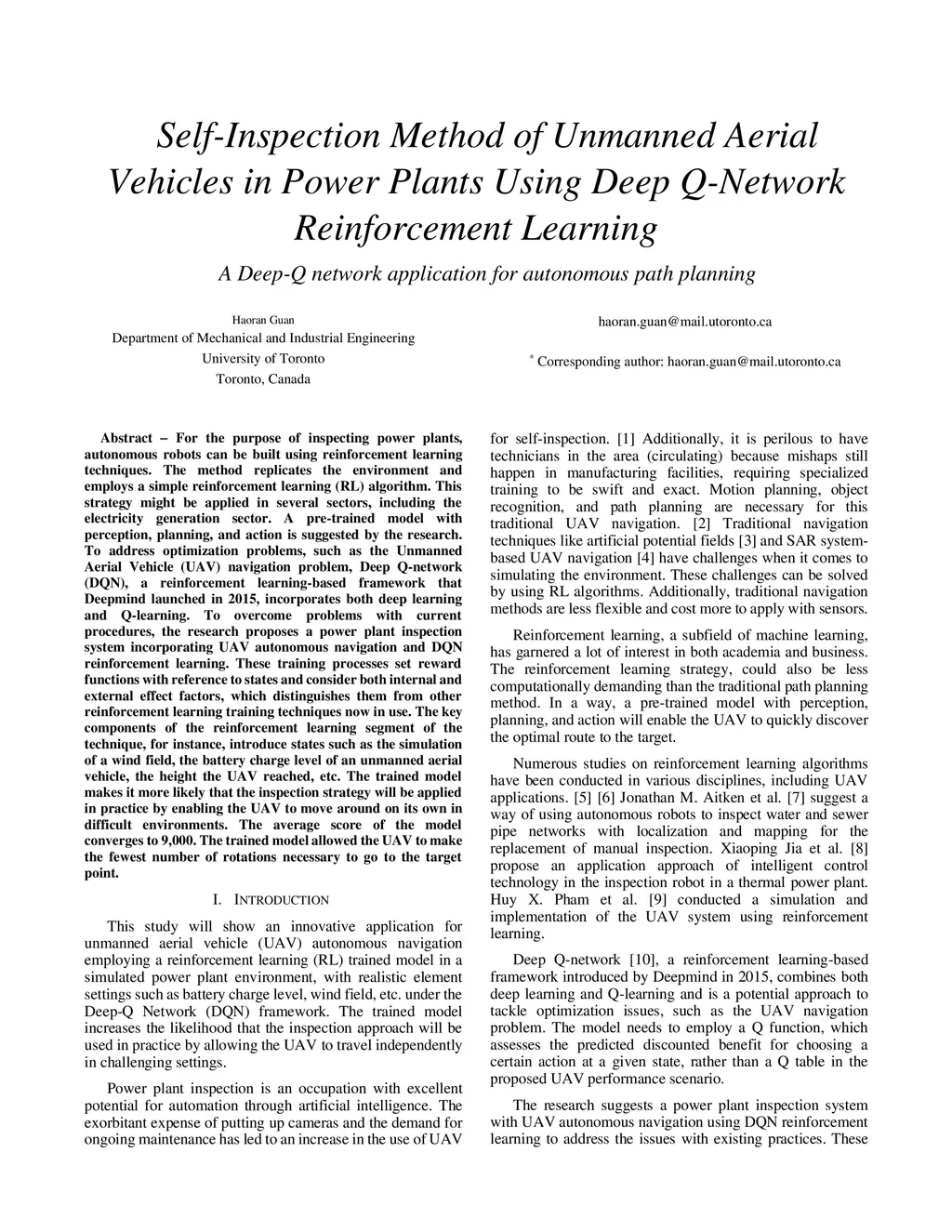 For the purpose of inspecting power plants, autonomous robots can be built using reinforcement learning techniques. The method replicates the environment and employs a simple reinforcement learning (RL) algorithm. This strategy might be applied in several sectors, including the electricity generation sector. A pre-trained model with perception, planning, and action is suggested by the research. To address optimization problems, such as the Unmanned Aerial Vehicle (UAV) navigation problem, Deep Q-network (DQN), a reinforcement learning-based framework that Deepmind launched in 2015, incorporates both deep learning and Q-learning. To overcome problems with current procedures, the research proposes a power plant inspection system incorporating UAV autonomous navigation and DQN reinforcement learning. These training processes set reward functions with reference to states and consider both internal and external effect factors, which distinguishes them from other reinforcement learning training techniques now in use. The key components of the reinforcement learning segment of the technique, for instance, introduce states such as the simulation of a wind field, the battery charge level of an unmanned aerial vehicle, the height the UAV reached, etc. The trained model makes it more likely that the inspection strategy will be applied in practice by enabling the UAV to move around on its own in difficult environments. The average score of the model converges to 9,000. The trained model allowed the UAV to make the fewest number of rotations necessary to go to the target point.