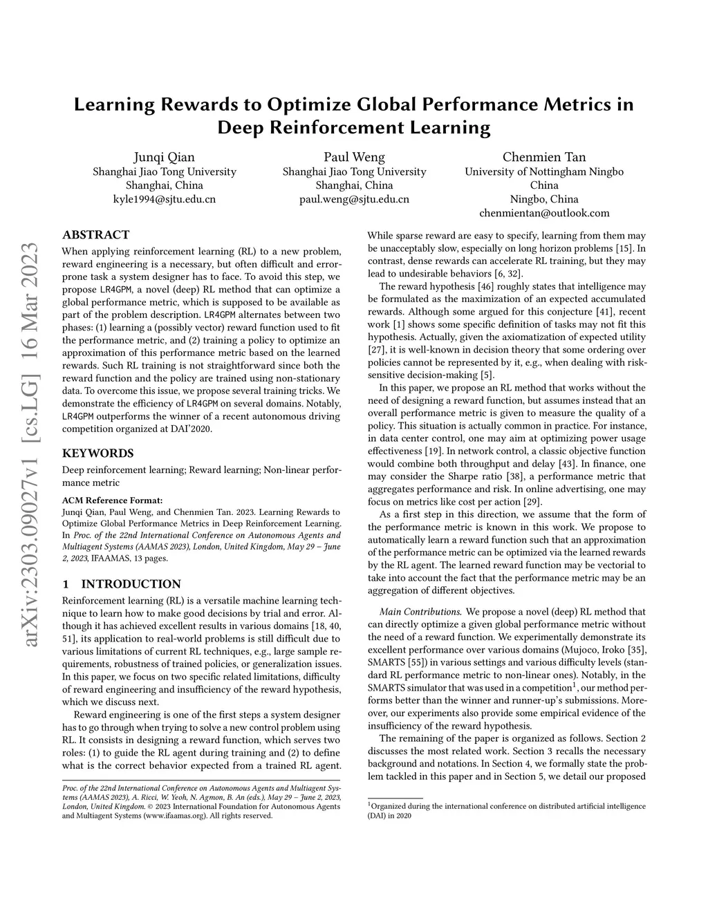 When applying reinforcement learning (RL) to a new problem, reward engineering is a necessary, but often difficult and error-prone task a system designer has to face. To avoid this step, we propose LR4GPM, a novel (deep) RL method that can optimize a global performance metric, which is supposed to be available as part of the problem description. LR4GPM alternates between two phases: (1) learning a (possibly vector) reward function used to fit the performance metric, and (2) training a policy to optimize an approximation of this performance metric based on the learned rewards. Such RL training is not straightforward since both the reward function and the policy are trained using non-stationary data. To overcome this issue, we propose several training tricks. We demonstrate the efficiency of LR4GPM on several domains. Notably, LR4GPM outperforms the winner of a recent autonomous driving competition organized at DAI'2020.